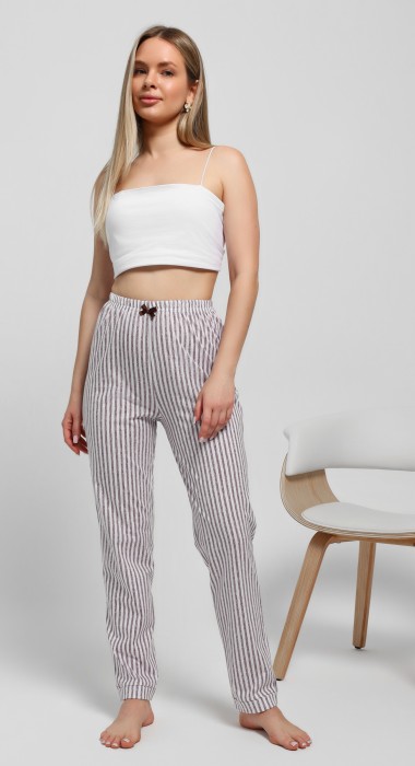Брюки – из полотна с набивным рисунком в полоску, слегка зауженные книзу, с эластичной тесьмой по талии и притачными манжетами по низу. В центре переда по верхнему срезу прикреплен небольшой декоративный бантик из узкой атласной ленты.