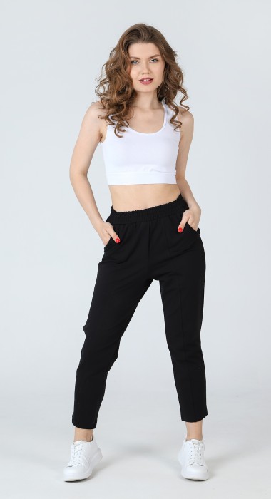 Брюки из трикотажного полотна «футер-двухнитка», слегка зауженные книзу, на притачном поясе с эластичной тесьмой внутри и карманами в боковых швах. Средний шов переда выполнен с имитацией застежки «гульфик». Передние половины - разрезные по линиям центра, а по швам стачивания выполнены отделочные строчки.