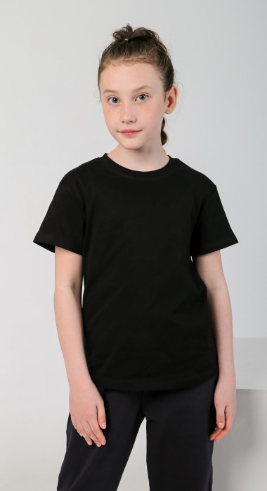 Базовая футболка для девочки, из кулирки плотностью 160г/м2. Модель со слегка спущенной линией плеч и округлым вырезом горловины.