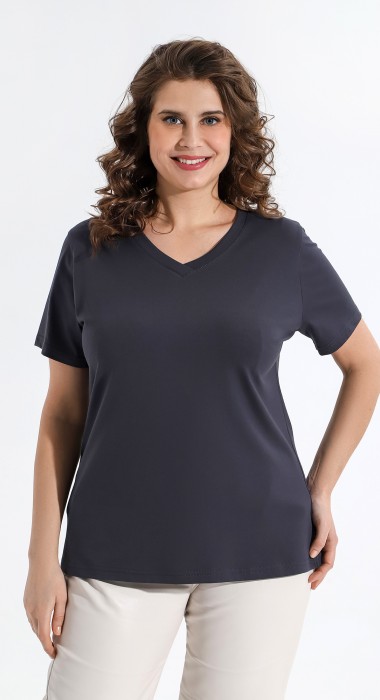 Футболка из гладкокрашеного трикотажного полотна «кулирка с лайкрой» классического покроя, с короткими втачными рукавами, горловиной V-образной формы, обработанной втачной планкой и принтом на полочке.