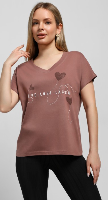 Футболка – из гладкокрашеного полотна, с короткими цельнокроеными рукавами, горловиной V-образной формы, обработанной притачной бейкой и принтом на полочке, выполненным в технике шелкографии.