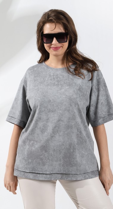Футболка из гладкокрашеного трикотажного полотна «кулирка» с эффектом «варенки», свободного покроя, горловиной овальной формы, обработанной притачной планкой. Низ рукавов и изделия состоит из двух частей, одна из которых с необработанным краем, другая с подгибкой и соединенных между собой накладным швом.