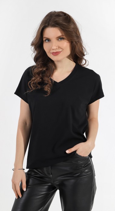 Футболка женская из трикотажного гладкокрашеного полотна «кулирка» с лайкрой, классического покроя, с короткими втачными рукавами и горловиной овальной формы, обработанной втачной планкой.