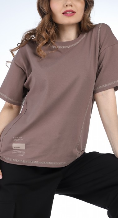 Футболка из гладкокрашенного трикотажного полотна «кулирка» с лайкрой, свободного силуэта, с короткими втачными рукавами, горловиной овальной формы, обработанной втачной планкой. На полочке принт, выполненный в технике «шелкографии». По рукавам, переду, горловине и низу изделия настрочена декоративная отделочная строчка.