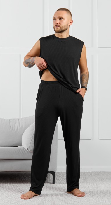 Брюки мужские из пластичного однотонного трикотажного полотна в рубчик, приятного к телу. Модель свободная, прямого силуэта, с боковыми карманами с обтачными входами, на притачном поясе с отстроченной эластичной тесьмой.