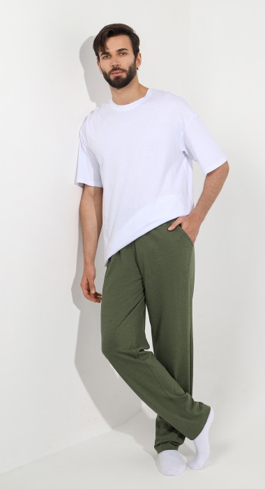 Брюки мужские из меланжированного трикотажного полотна "кулирка", прямого силуэта, с карманами в боковых швах, на притачном поясе с эластичной тесьмой внутри. В центре пояса - две обметанные петли , через которые продет шнурок для регулирования степени прилегания шорт по талии.