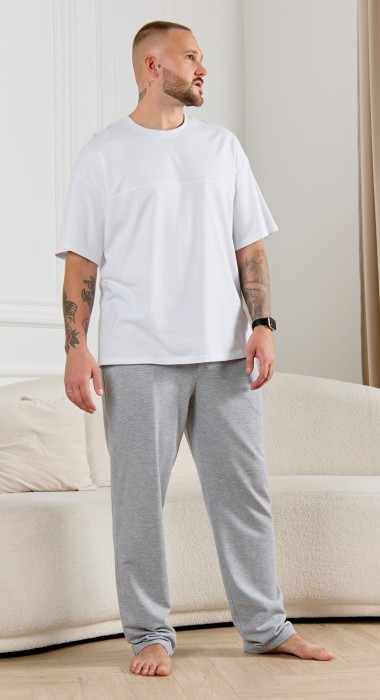 Брюки мужские из гладкокрашенго трикотажного полотна "футер 2 -нитка", свободного покроя, на притачном поясе с эластичной тесьмой внутри, с карманами в боковых швах. Нижние срезы обработаны подгибкой.