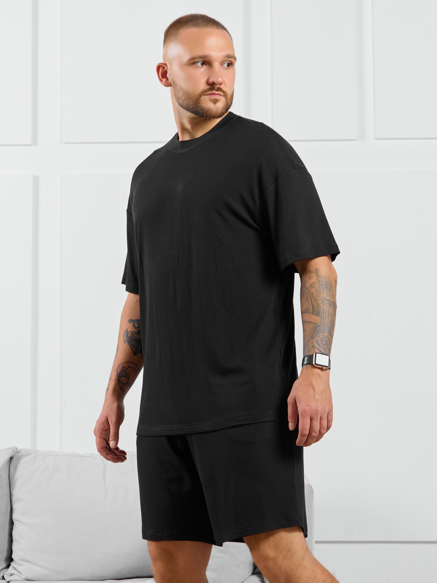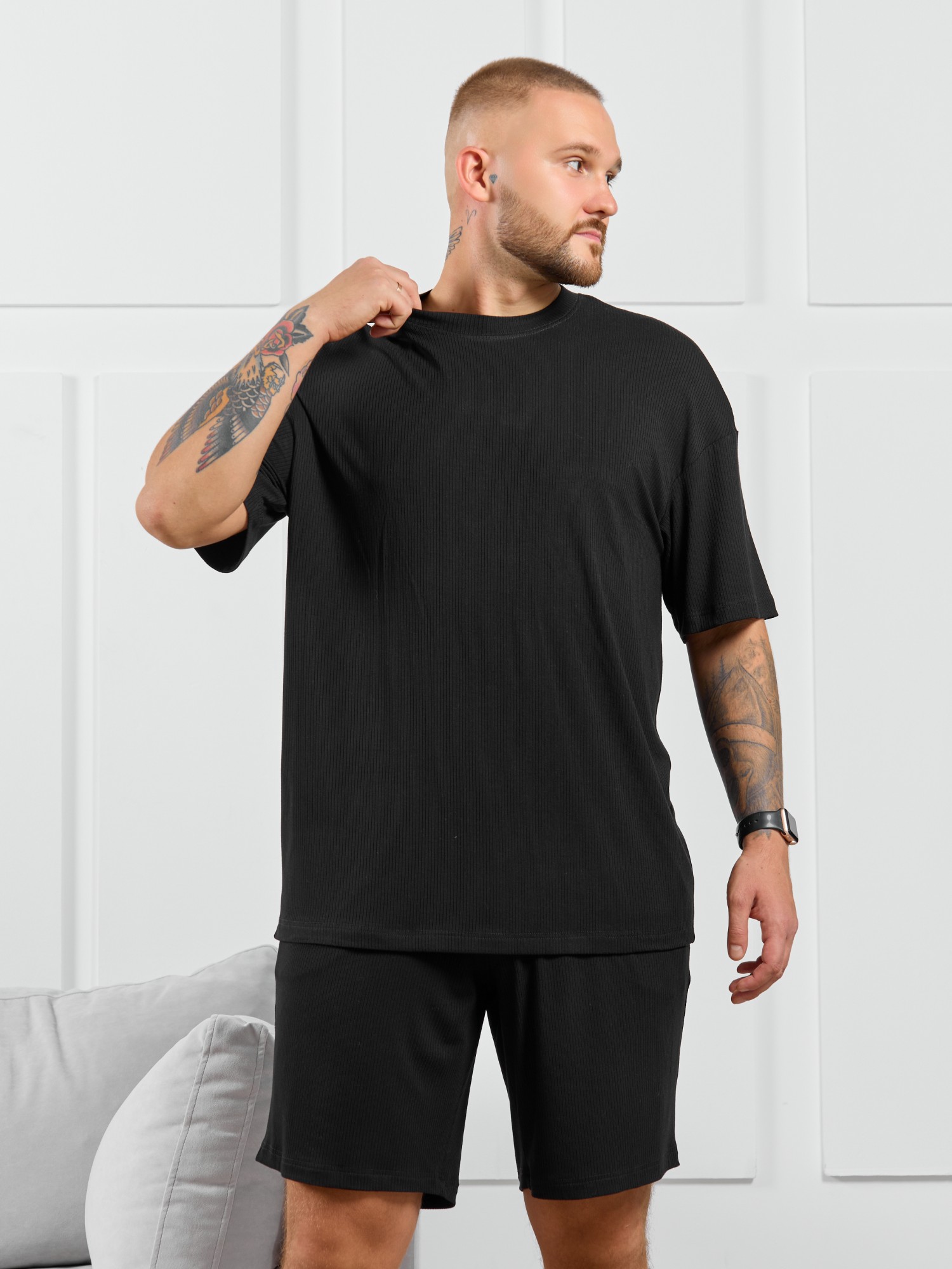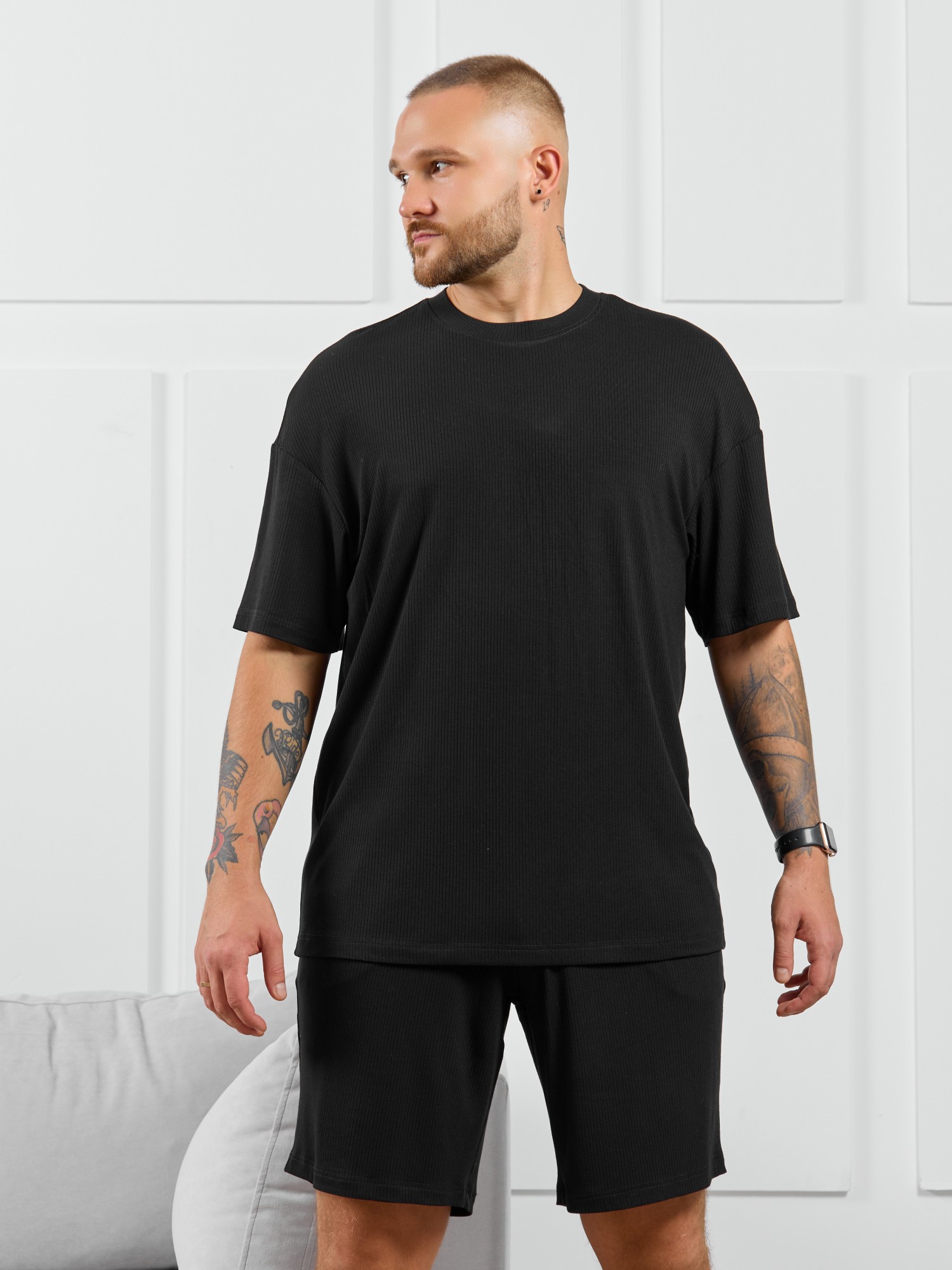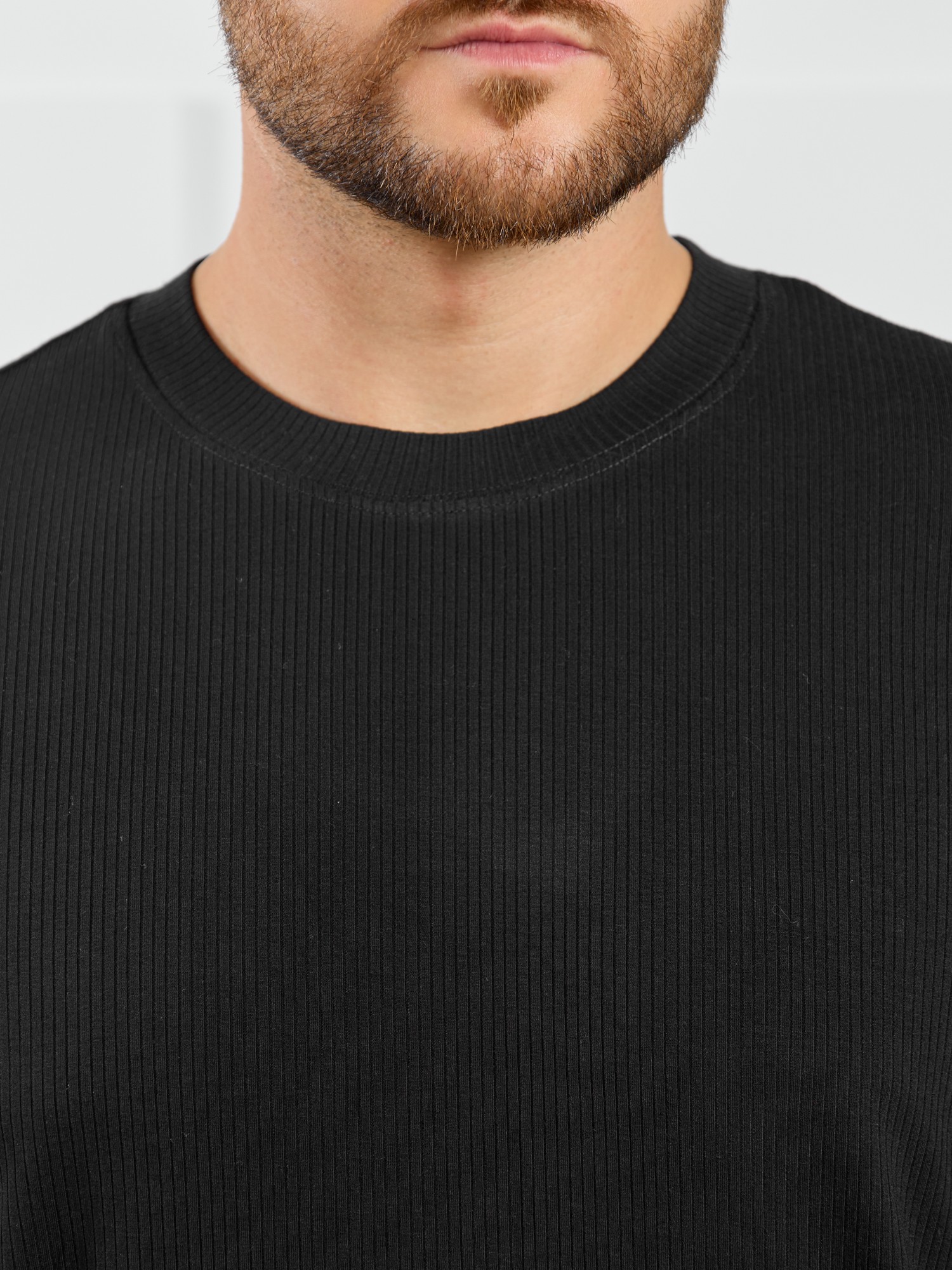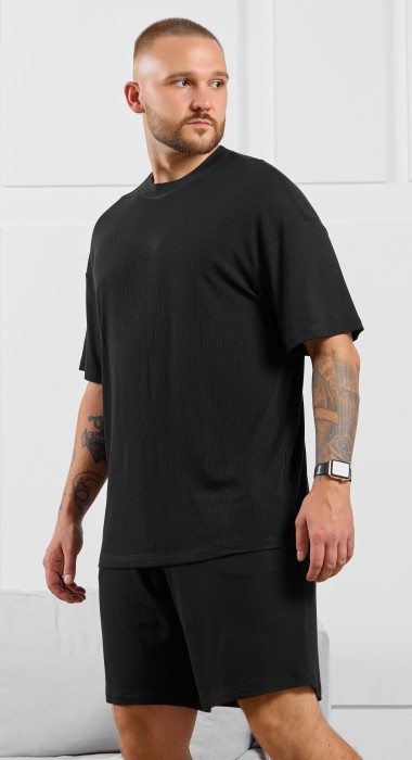 Футболка мужская из пластичного однотонного трикотажного полотна в рубчик, приятного к телу. Модель свободная, со спущенной линией плеч, рукавами длиной до локтя. Может подойти для отдыха, прогулок и занятий спортом.