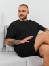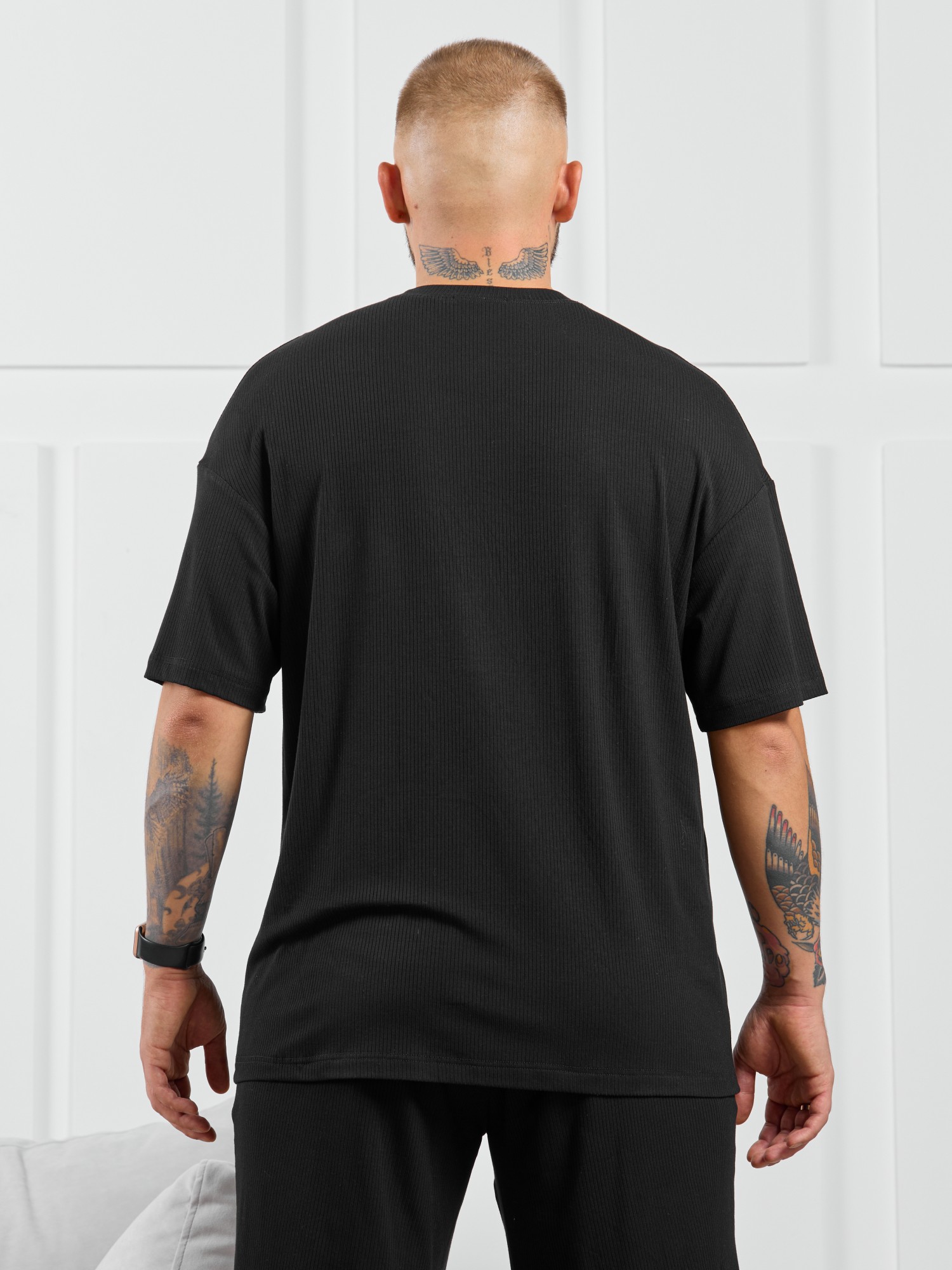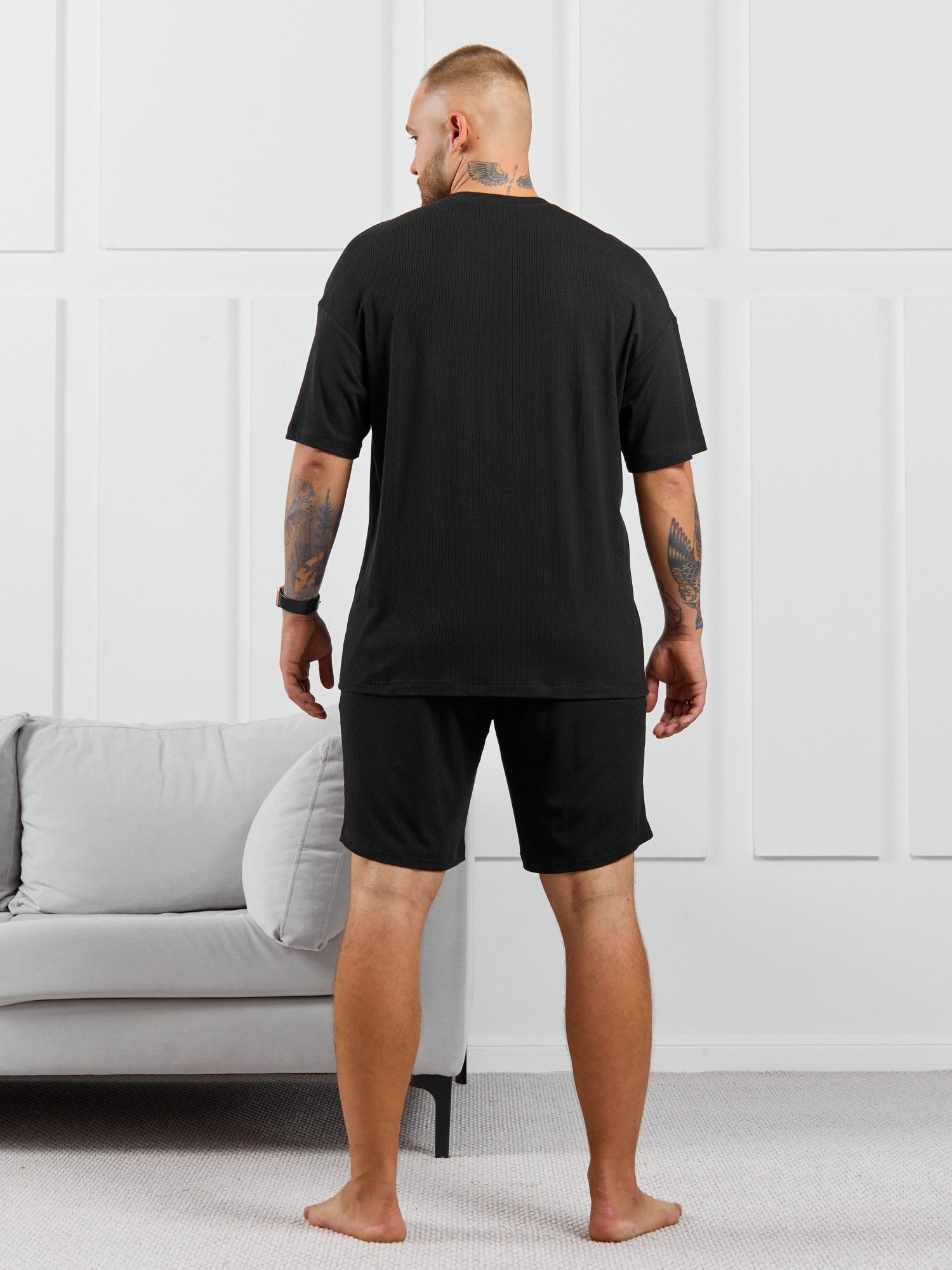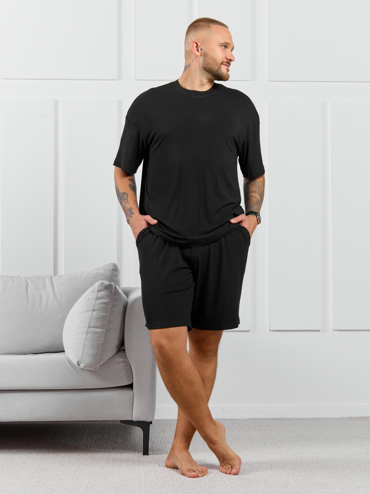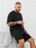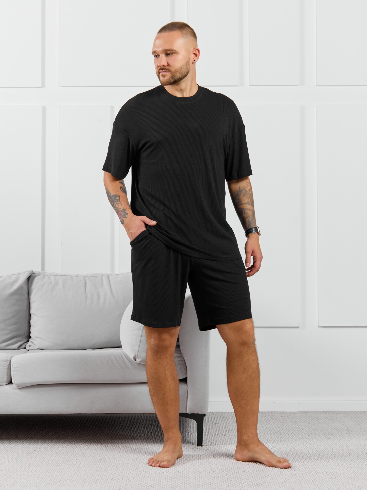 Футболка мужская из пластичного однотонного трикотажного полотна в рубчик, приятного к телу. Модель свободная, со спущенной линией плеч, рукавами длиной до локтя. Может подойти для отдыха, прогулок и занятий спортом.
