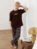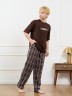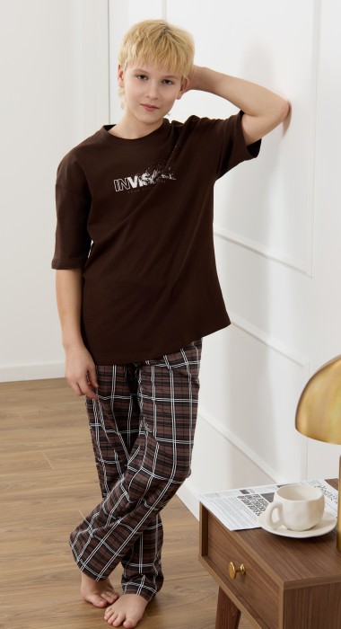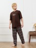 Костюм для мальчика из трикотажного полотна "кулирка", состоящий из футболки и брюк. Футболка классического покроя, с короткими втачными рукавами и приспущенной линией плеч, горловиной овальной формы, обработанной втачной планкой и принтом на детали переда, выполненным в технике шелкографии. Нижние срезы рукавов и изделия обработаны подгибкой. По горловине настрочена отделочная строчка. Брюки - длинные, на притачном поясе с эластичной тесьмой внутри, с карманами в боковых швах. Нижние срезы обработаны подгибкой.