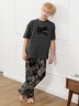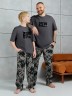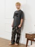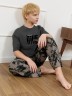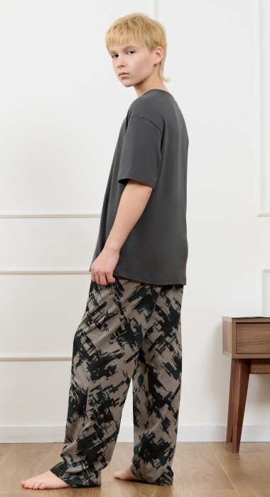 Костюм для мальчика, состоящий из футболки и брюк. Футболка однотонная с принтом на груди; модель свободная, со спущенной линией плеч, овальным вырезом горловины. Брюки из полотна с набивным рисунком эксклюзивного дизайна, прямые, с боковыми карманами с обтачными входами, на притачном поясе с отстроченной эластичной тесьмой.