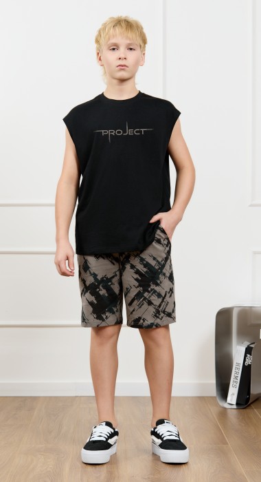 Костюм для мальчика, состоящий из майки и шорт. Майка однотонная с принтом на груди; модель свободная, со спущенной линией плеч и углубленной проймой. Шорты из полотна с набивным рисунком эксклюзивного дизайна, с боковыми карманами с обтачными входами, на притачном поясе с отстроченной эластичной тесьмой.