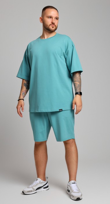 Костюм мужской из плотного гладкокрашеного трикотажного полотна "кулирка", состоящий из футболки и шорт. Футболка - свободного покроя, с удлиненными плечевым и швами, короткими втачными рукавами и горловиной овальной формы, обработанной втачной планкой. В нижней части переда слева настрочен декоративный элемент прямоугольной формы. По горловине проложена отделочная строчка. Шорты - классического покроя, на притачном поясе с эластичной тесьмой внутри и карманами в боковых швах. Для регулирования степени прилегания шорт по талии в пояс вставлен шнурок, продетый через две петли в центре пояса.