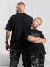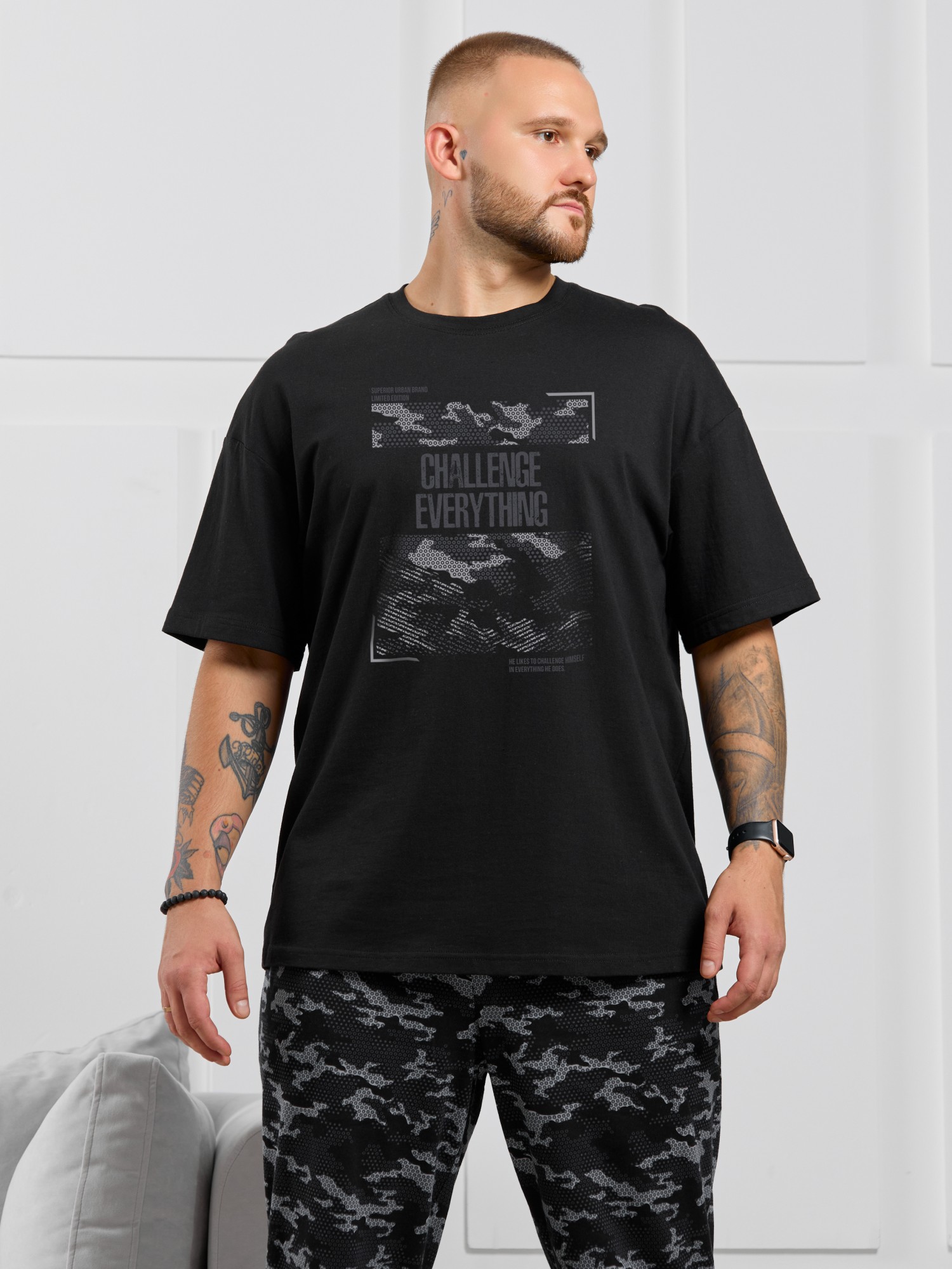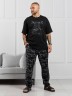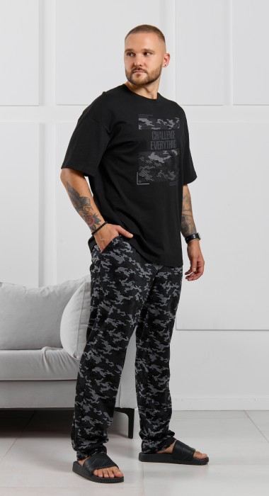 Костюм мужской, состоящий из футболки и брюк. Футболка однотонная с принтом на груди; модель свободная, со спущенной линией плеч, овальным вырезом горловины. Брюки из полотна с набивным рисунком эксклюзивного дизайна, прямые, с боковыми карманами с обтачными входами, на притачном поясе с отстроченной эластичной тесьмой.