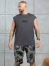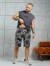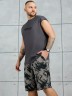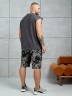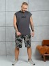 Костюм мужской, состоящий из майки и шорт. Майка однотонная с принтом на груди; модель свободная, со спущенной линией плеч и углубленной проймой. Шорты из полотна с набивным рисунком эксклюзивного дизайна, с боковыми карманами с обтачными входами, на притачном поясе с отстроченной эластичной тесьмой.