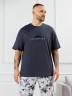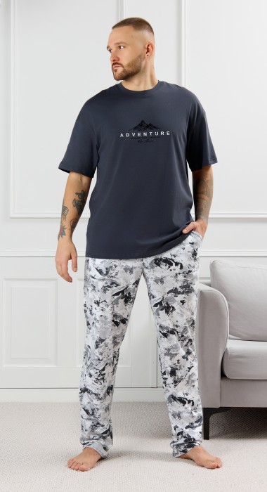 Костюм мужской, состоящий из футболки и брюк. Футболка однотонная с принтом на груди; модель свободная, со спущенной линией плеч, овальным вырезом горловины. Брюки из полотна с набивным рисунком эксклюзивного дизайна, прямые, с боковыми карманами с обтачными входами, на притачном поясе с отстроченной эластичной тесьмой.