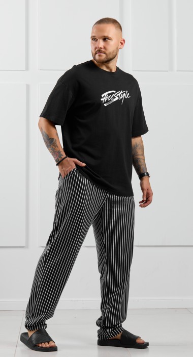 Костюм мужской, состоящий из футболки и брюк. Футболка однотонная с принтом на груди; модель свободная, со спущенной линией плеч. Брюки из полотна с набивным рисунком в узкую черно-белую полоску, прямые, с боковыми карманами с обтачными входами, на притачном поясе с отстроченной эластичной тесьмой.