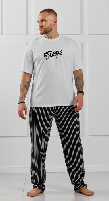 Костюм мужской, состоящий из футболки и брюк. Футболка однотонная с принтом на груди; модель свободная, со спущенной линией плеч. Брюки из полотна с набивным рисунком в узкую черно-белую полоску, прямые, с боковыми карманами с обтачными входами, на притачном поясе с отстроченной эластичной тесьмой.