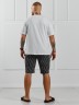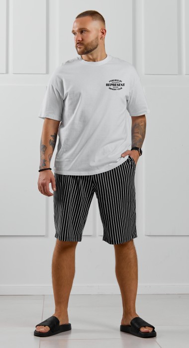 Костюм мужской, состоящий из футболки и шорт. Футболка однотонная с принтом на груди; модель свободная, со спущенной линией плеч. Шорты из полотна с набивным рисунком в узкую черно-белую полоску, с боковыми карманами с обтачными входами, на притачном поясе с отстроченной эластичной тесьмой.