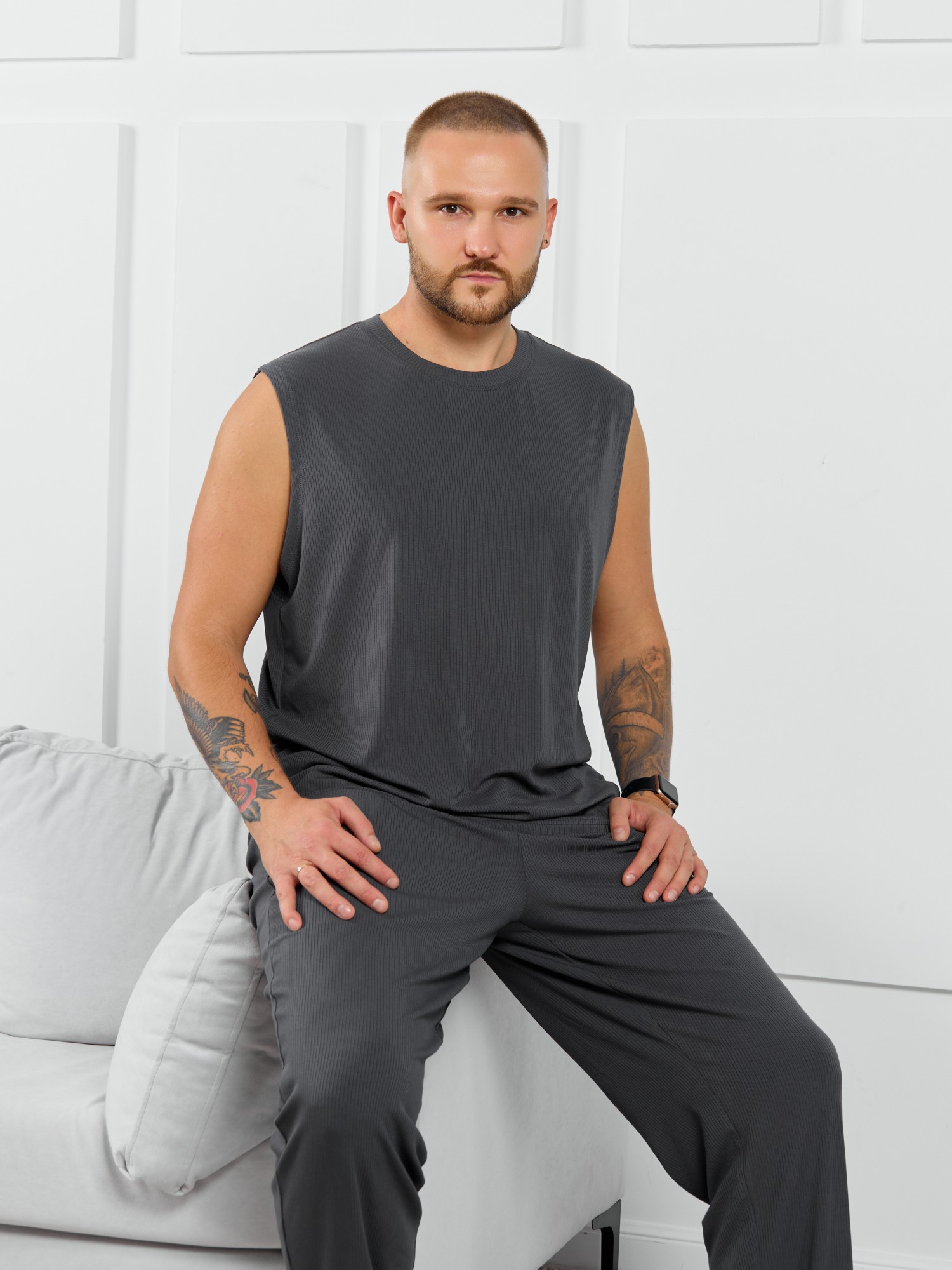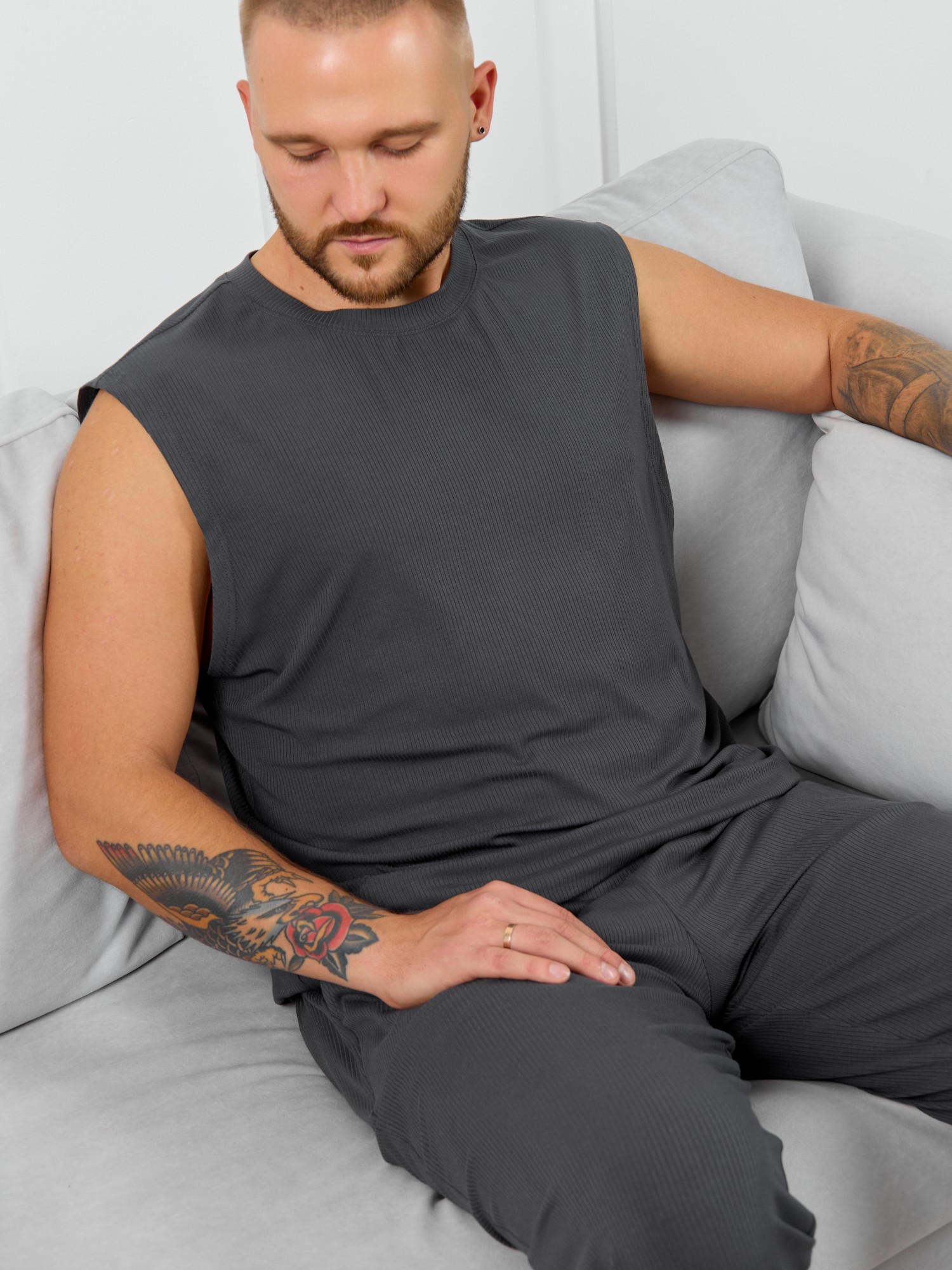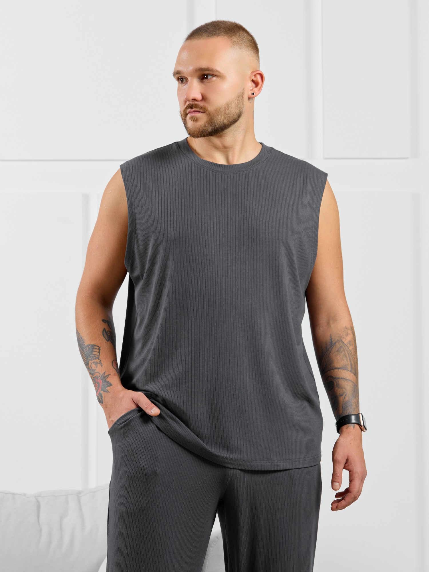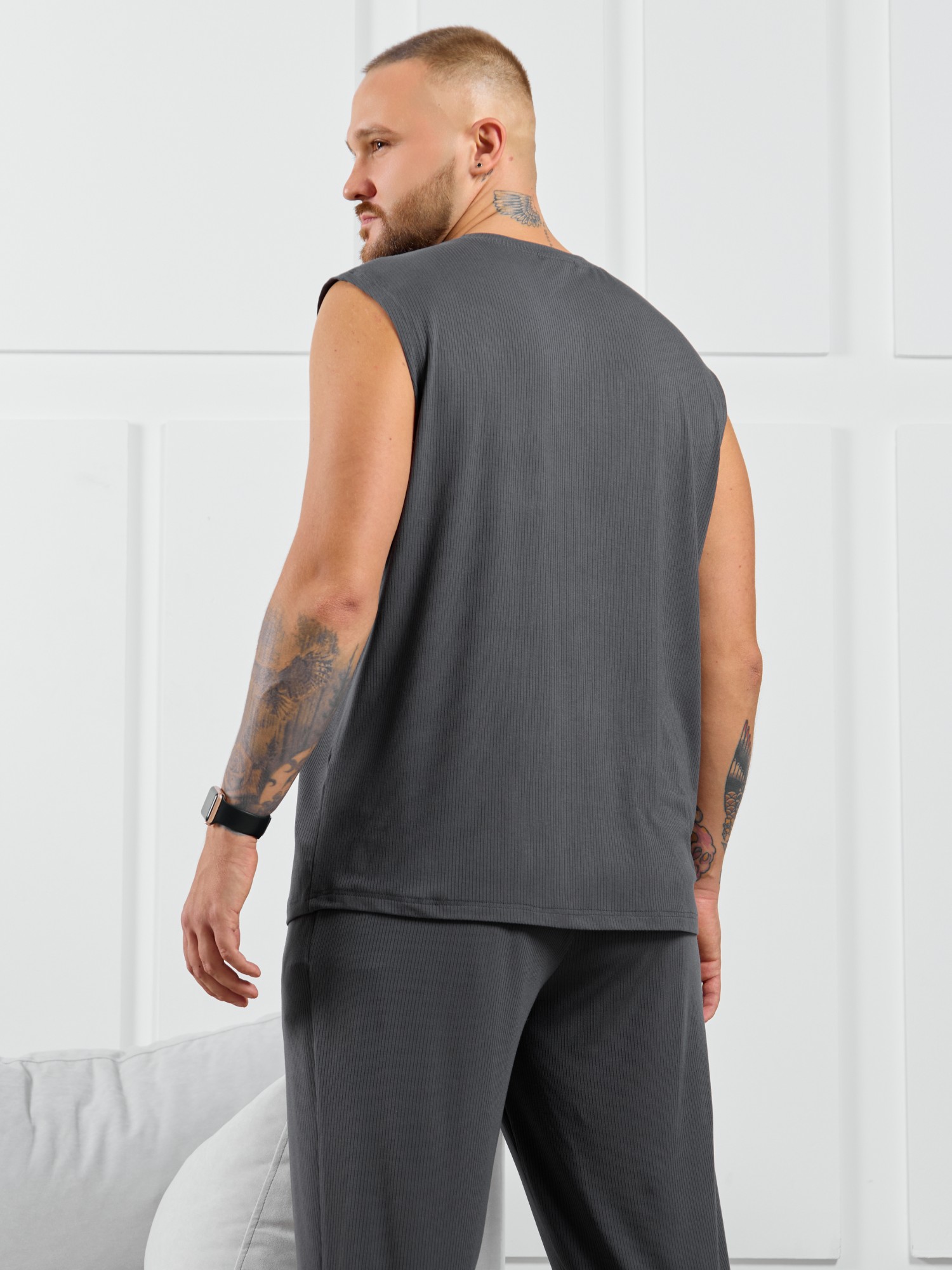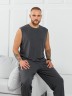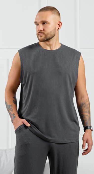 Майка мужская из пластичного однотонного трикотажного полотна в рубчик, приятного к телу. Модель свободная, с широкой спущенной линией плеч, глубокой проймой. Может подойти для отдыха, прогулок и занятий в спортзале.