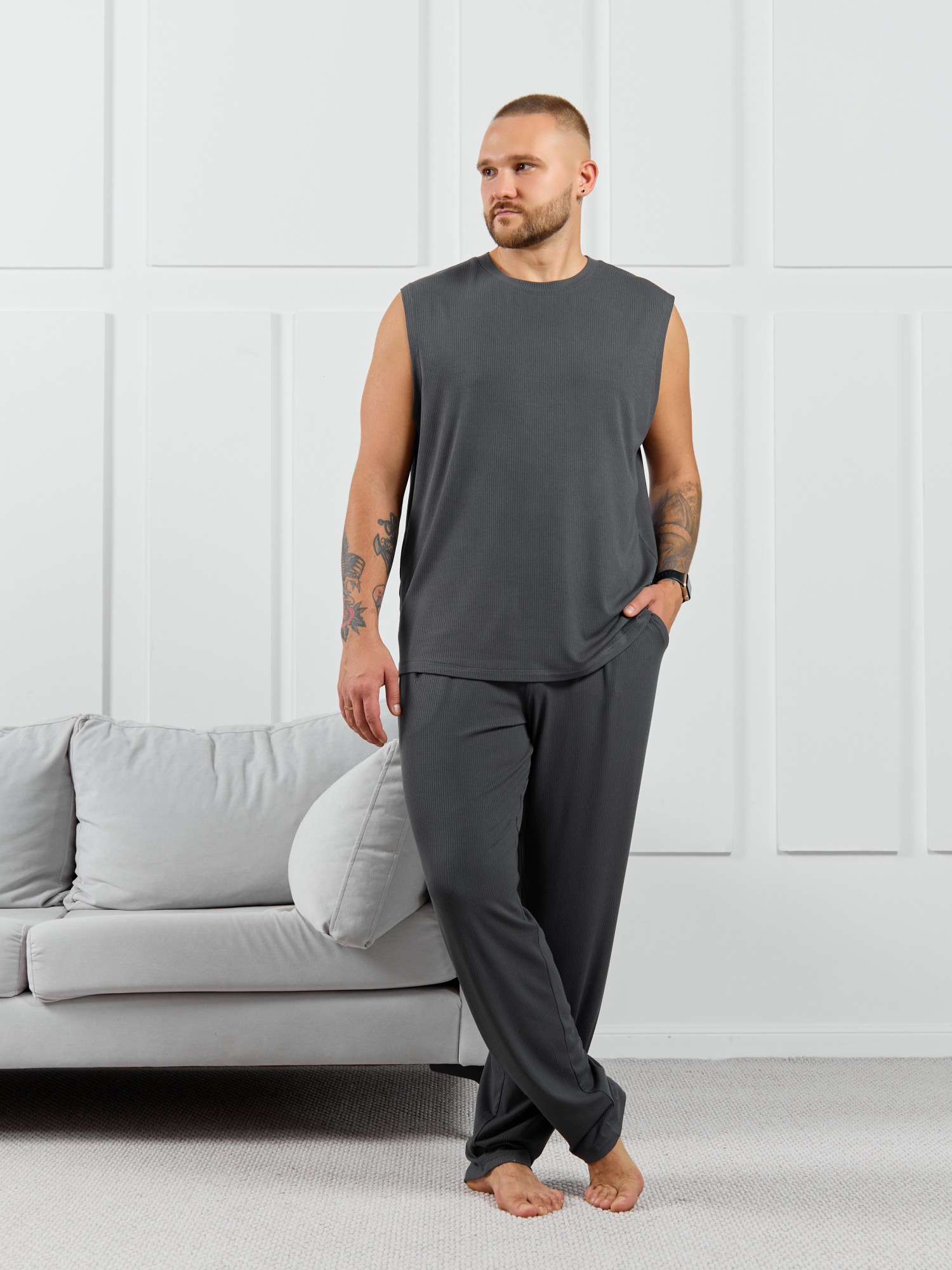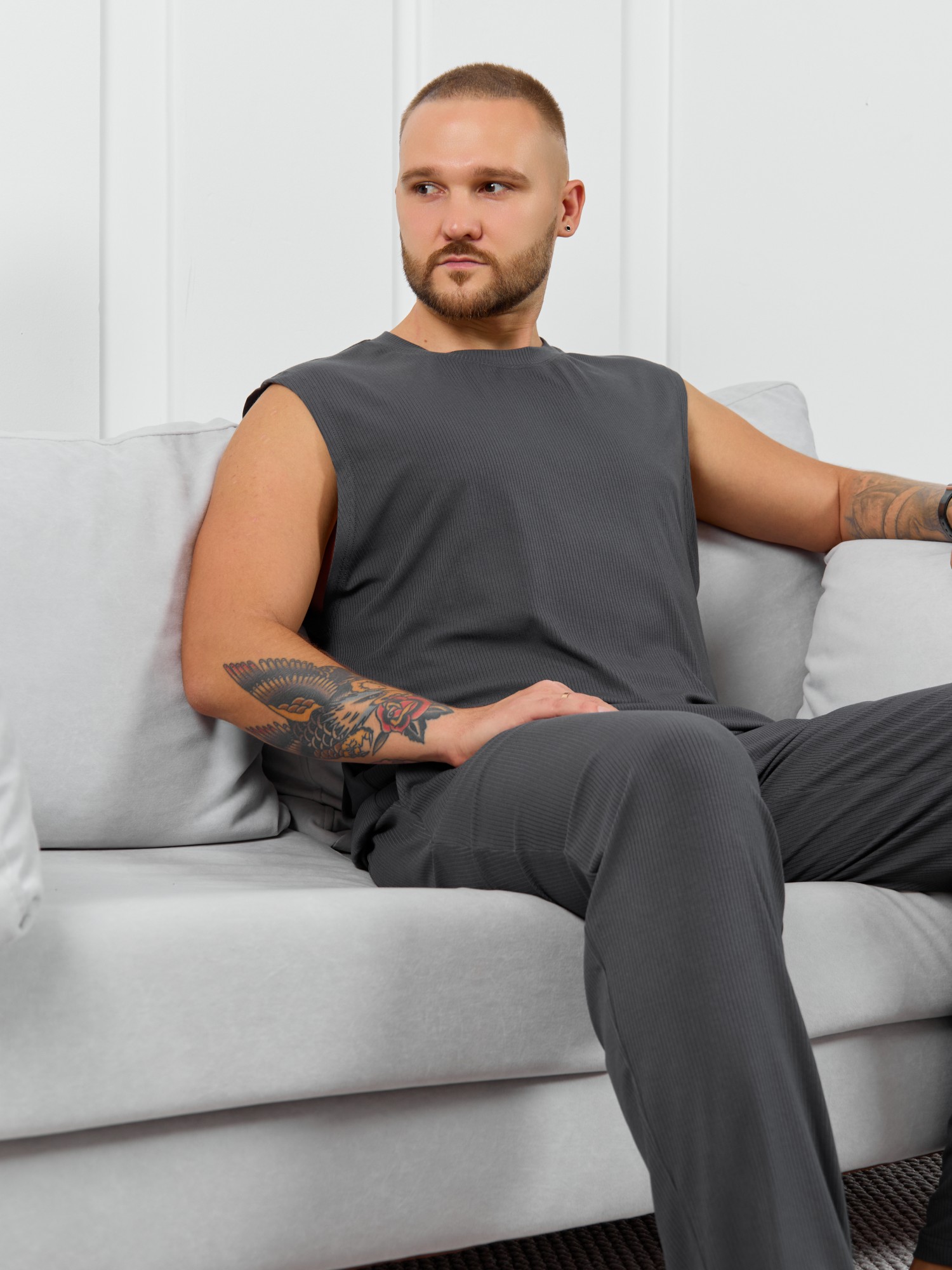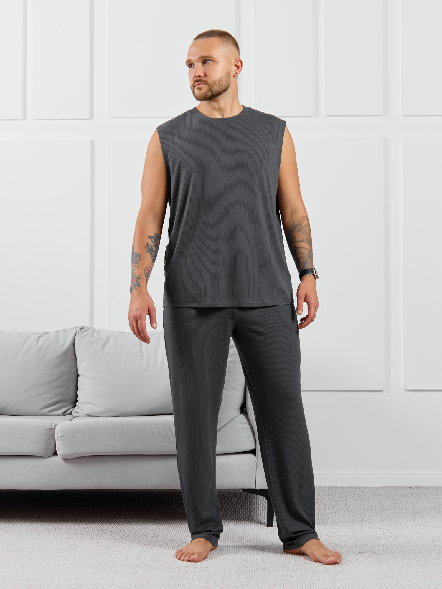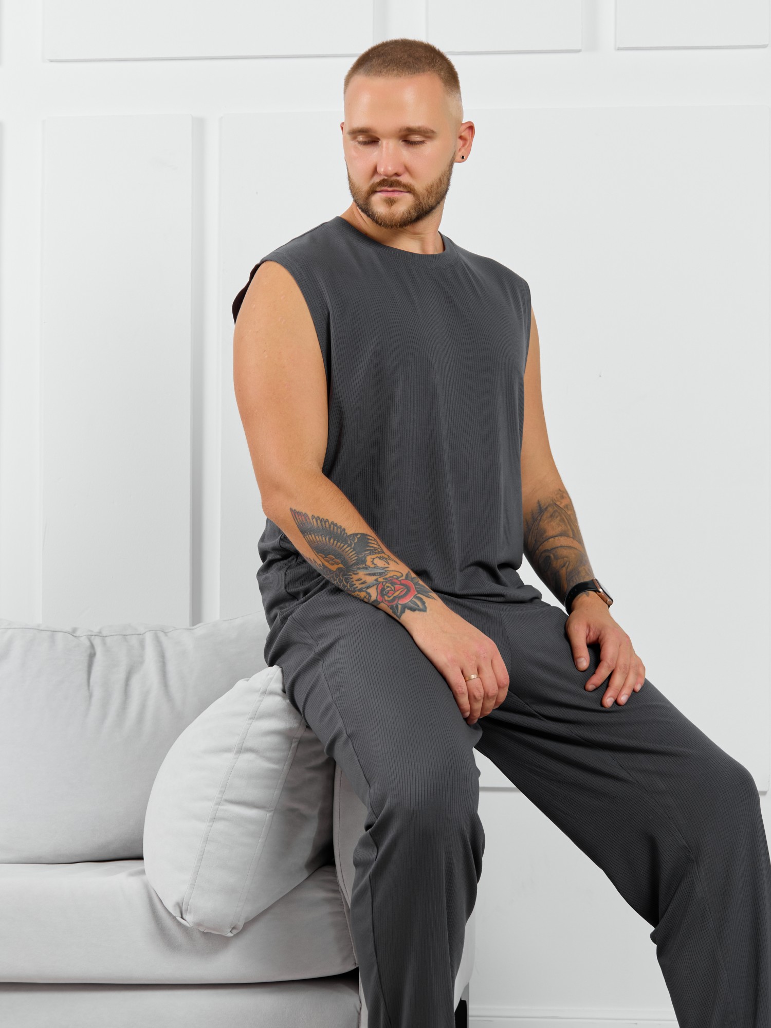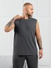 Майка мужская из пластичного однотонного трикотажного полотна в рубчик, приятного к телу. Модель свободная, с широкой спущенной линией плеч, глубокой проймой. Может подойти для отдыха, прогулок и занятий в спортзале.