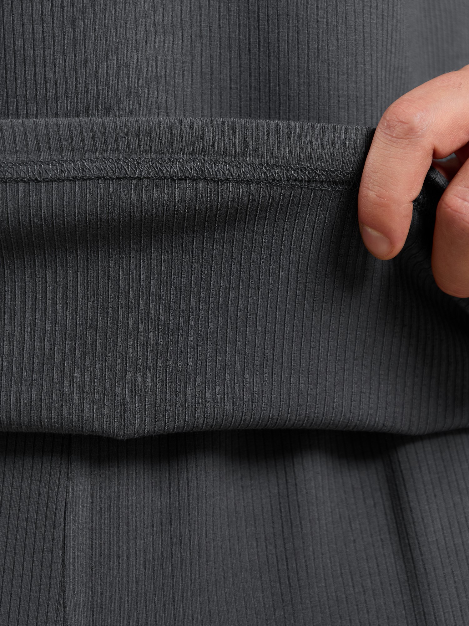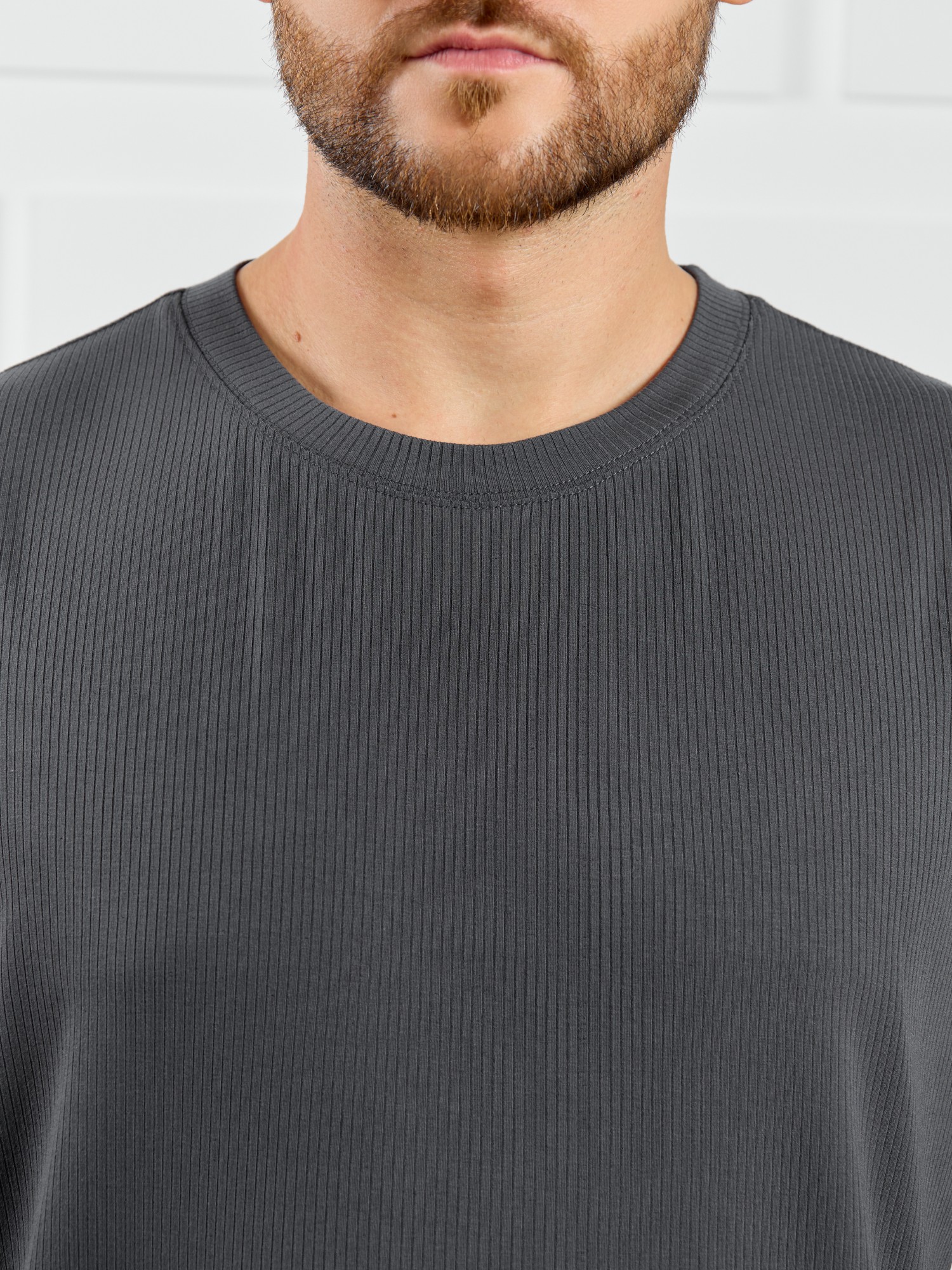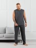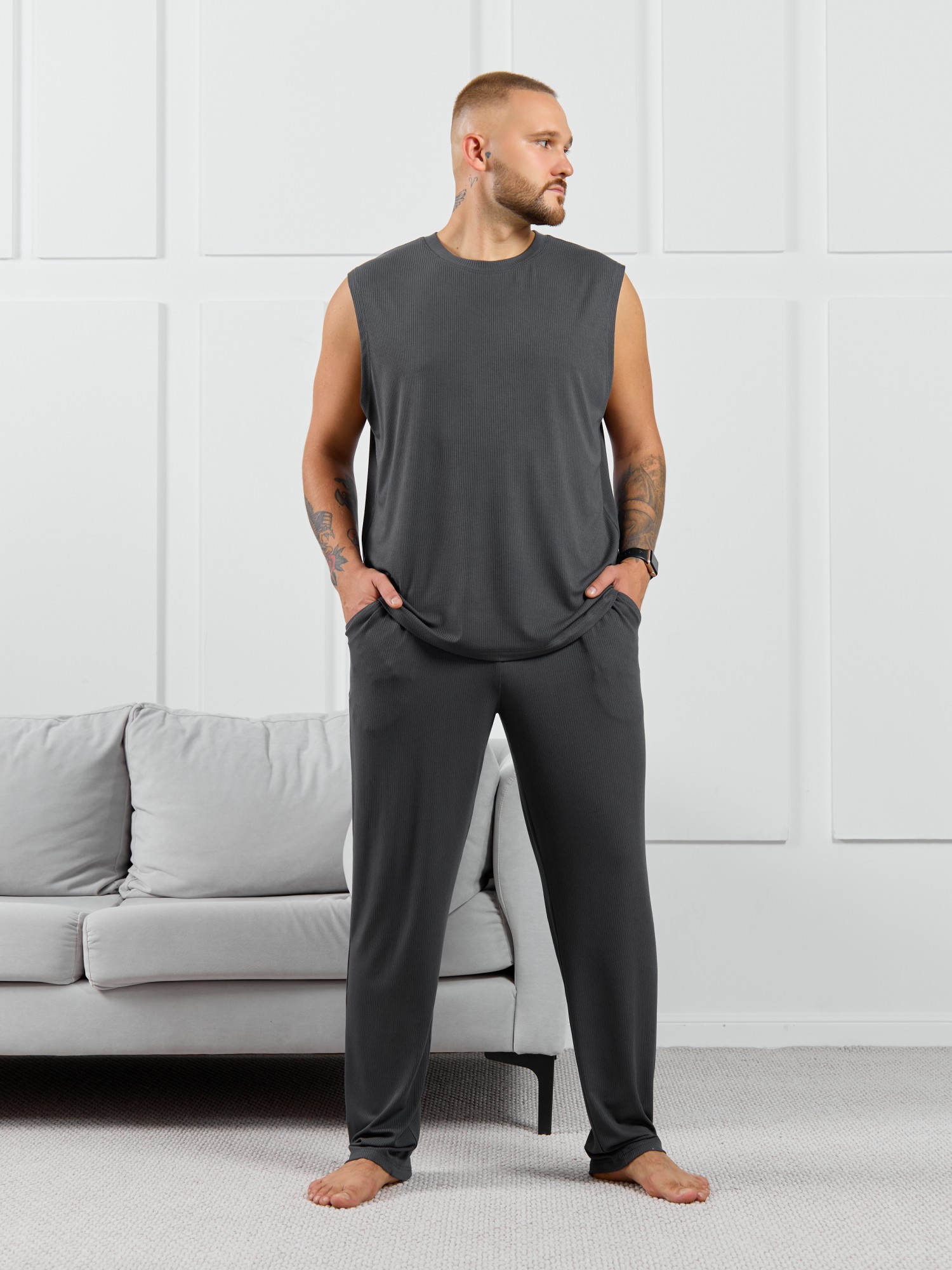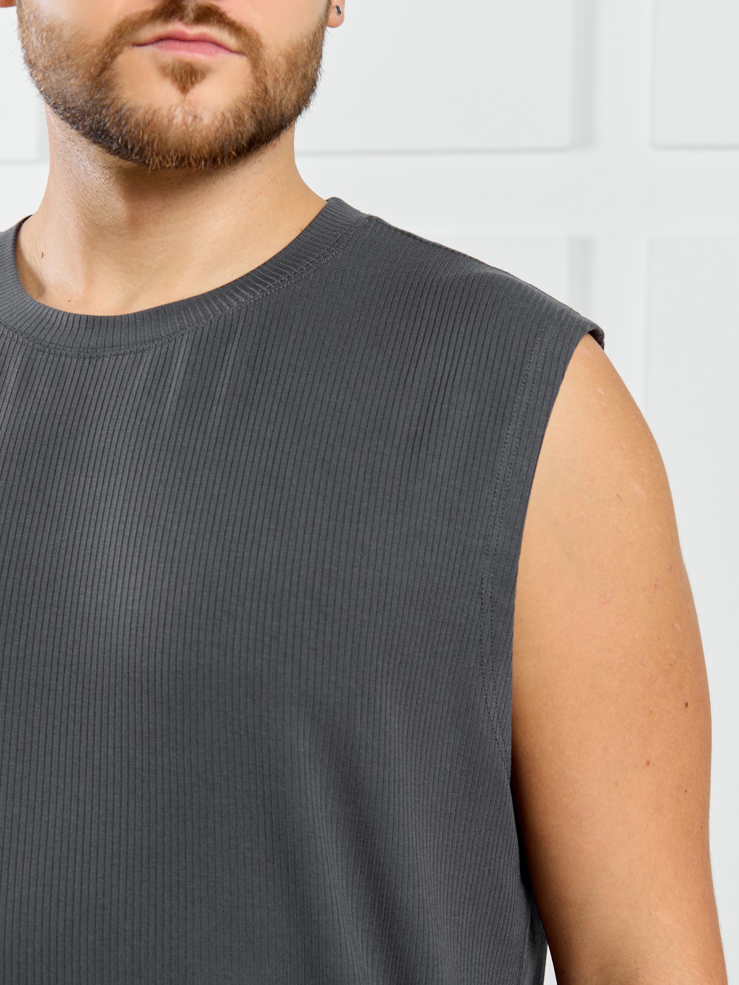 Майка мужская из пластичного однотонного трикотажного полотна в рубчик, приятного к телу. Модель свободная, с широкой спущенной линией плеч, глубокой проймой. Может подойти для отдыха, прогулок и занятий в спортзале.