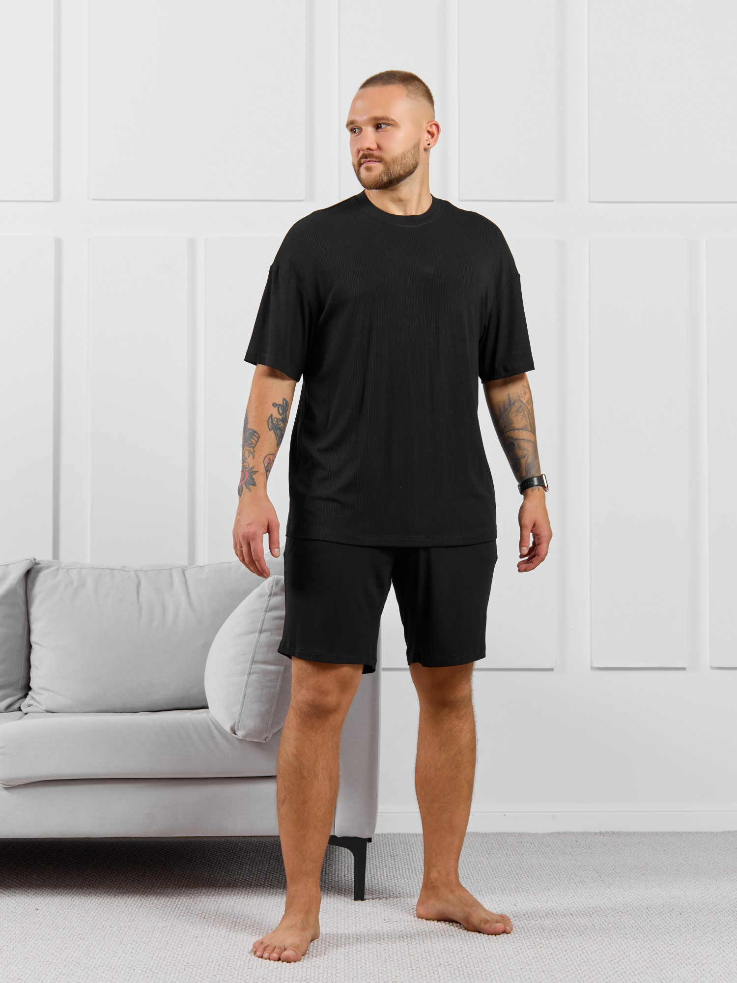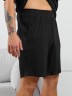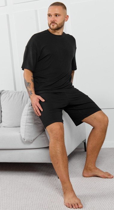 Шорты мужские из пластичного однотонного трикотажного полотна в рубчик, приятного к телу. Модель свободная, с боковыми карманами с обтачными входами, на притачном поясе с отстроченной эластичной тесьмой.