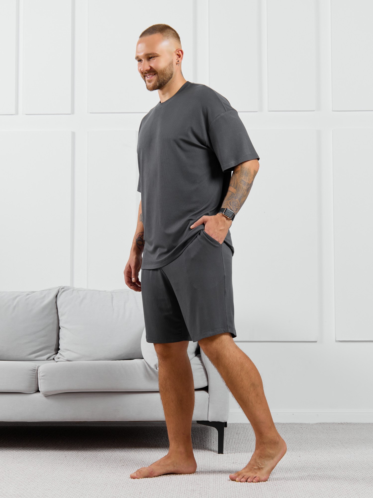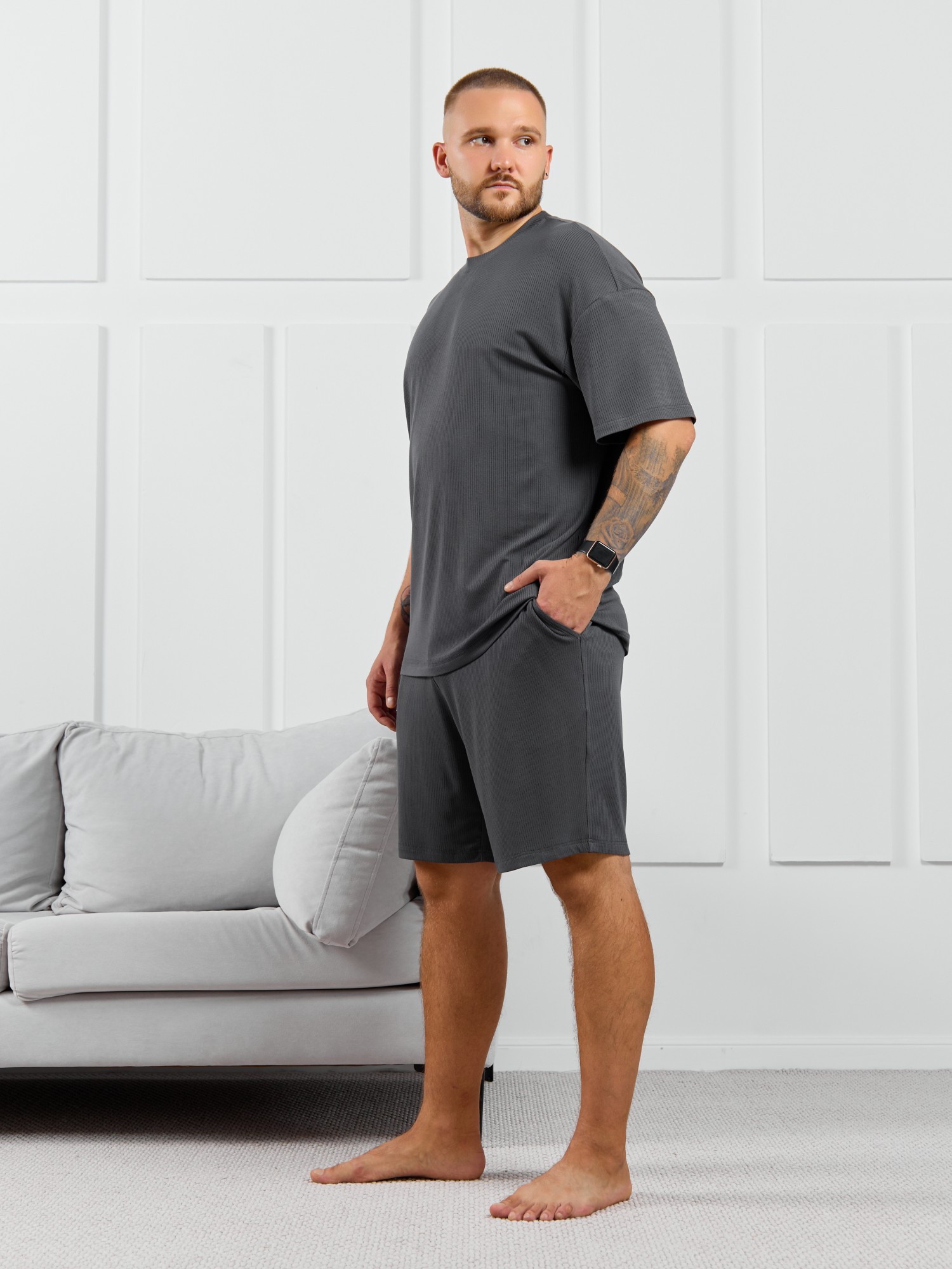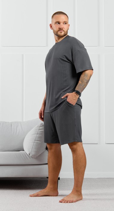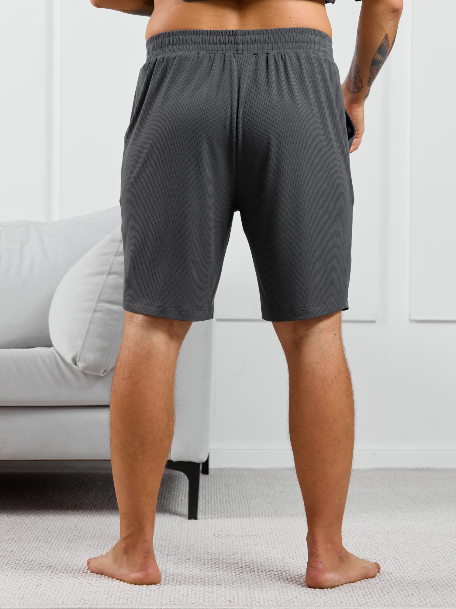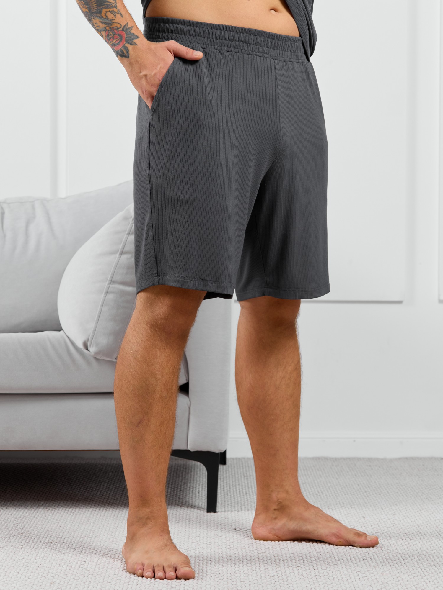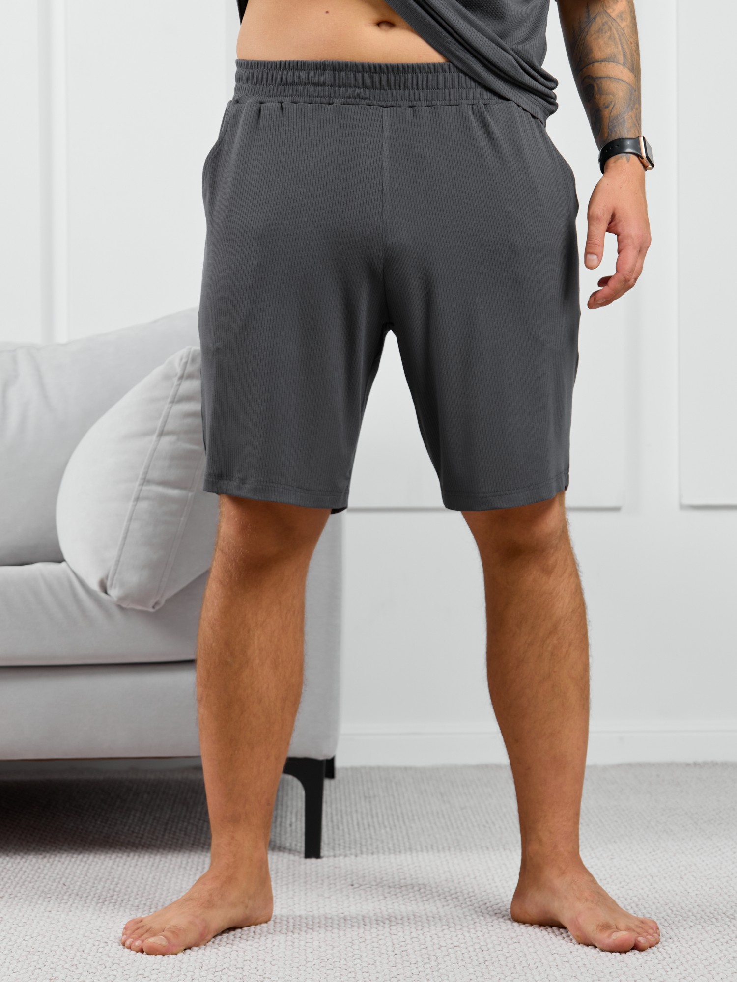 Шорты мужские из пластичного однотонного трикотажного полотна в рубчик, приятного к телу. Модель свободная, с боковыми карманами с обтачными входами, на притачном поясе с отстроченной эластичной тесьмой.