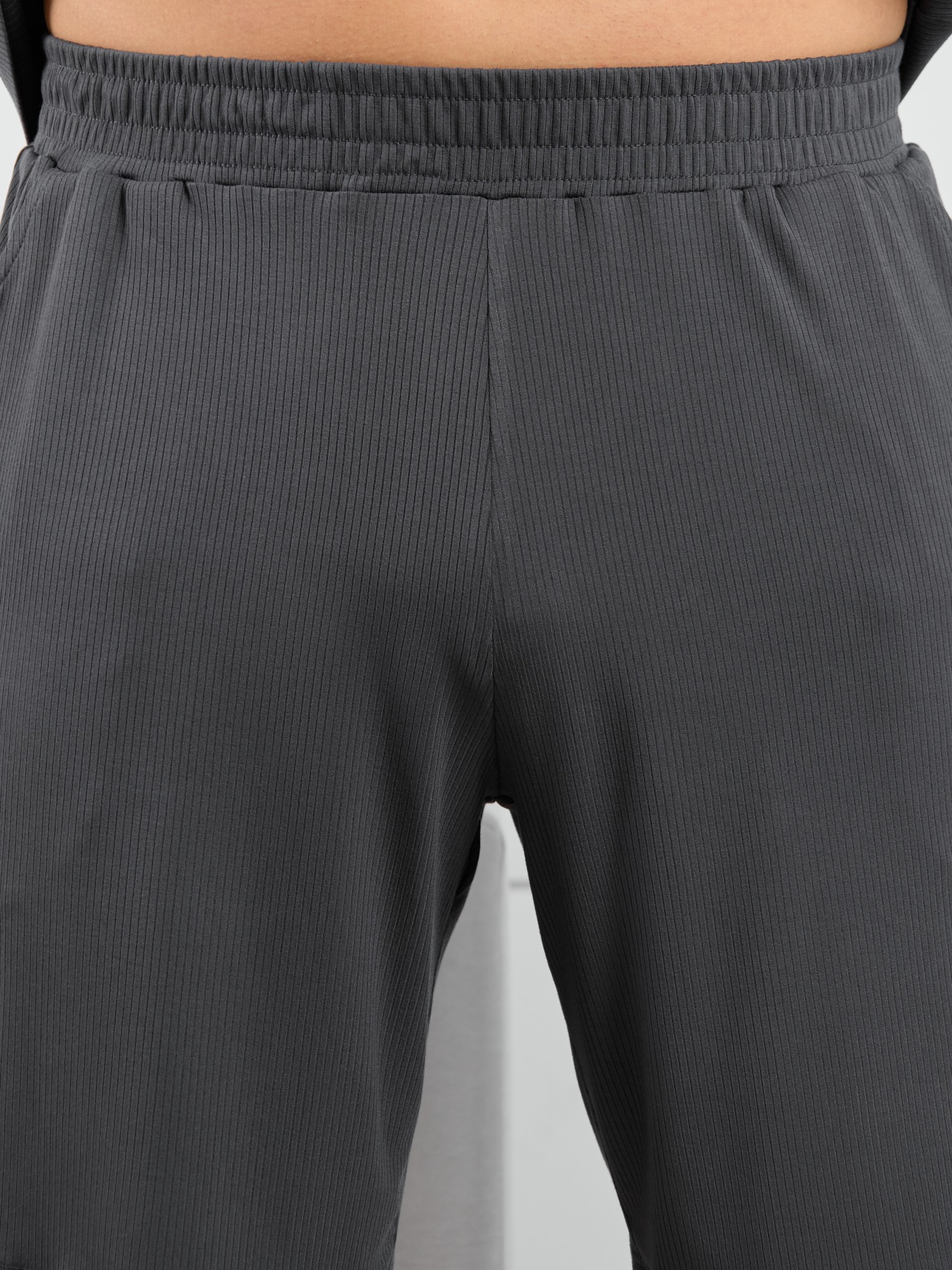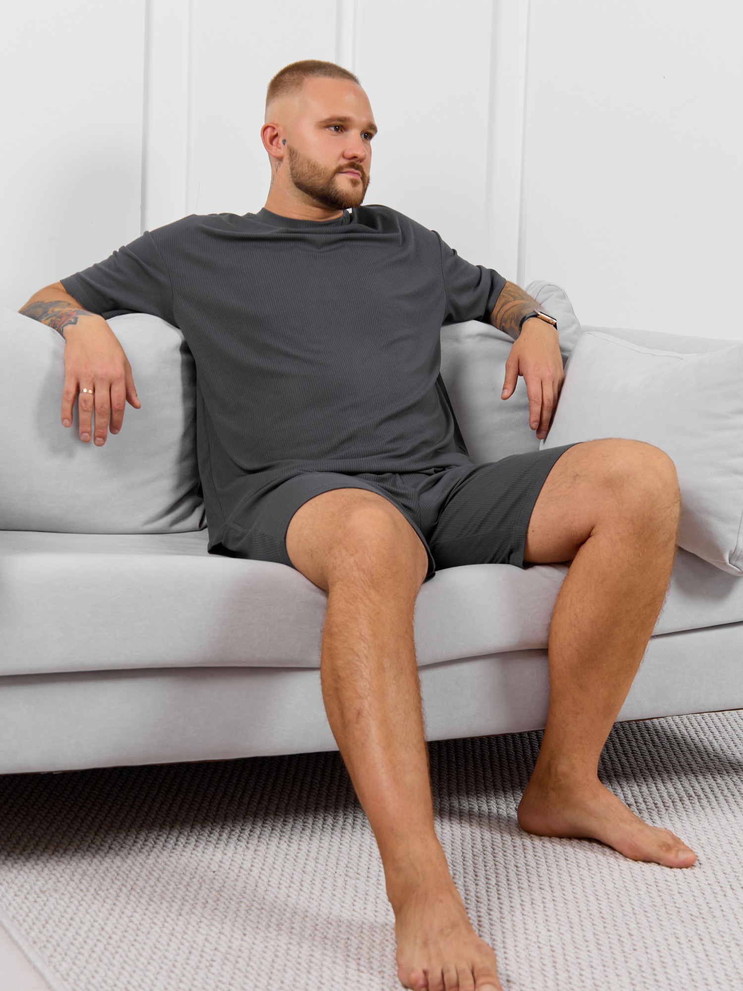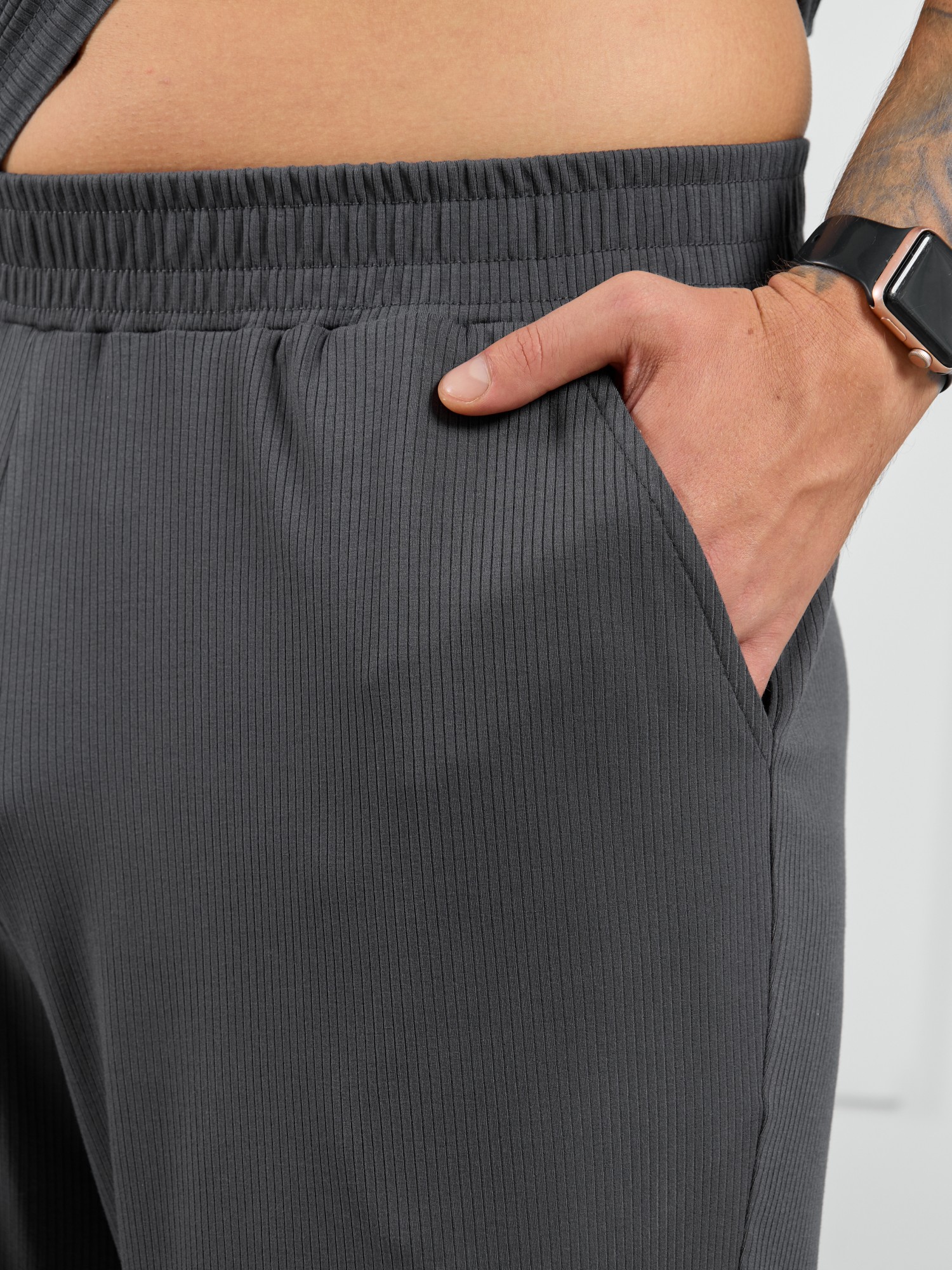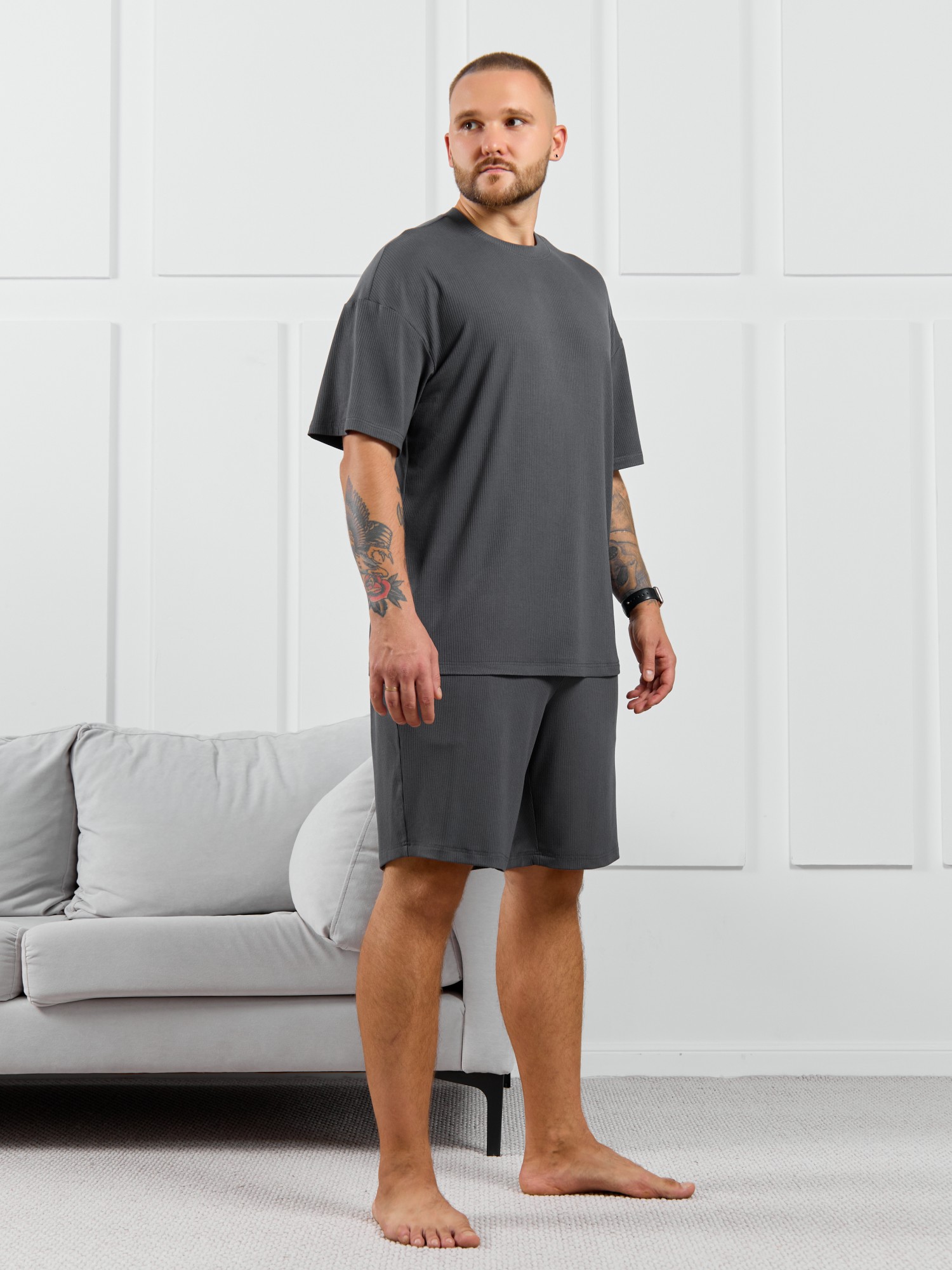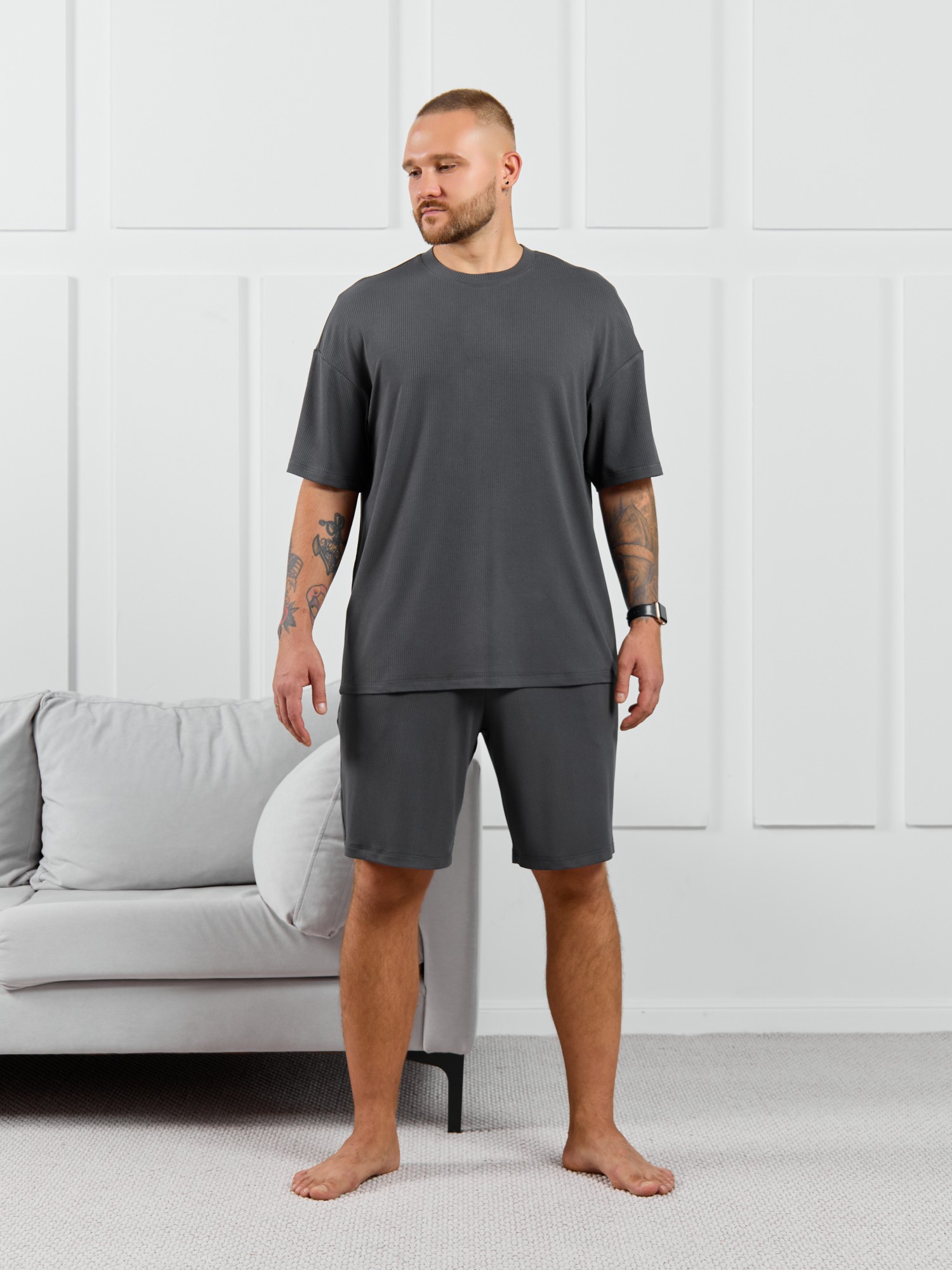 Шорты мужские из пластичного однотонного трикотажного полотна в рубчик, приятного к телу. Модель свободная, с боковыми карманами с обтачными входами, на притачном поясе с отстроченной эластичной тесьмой.