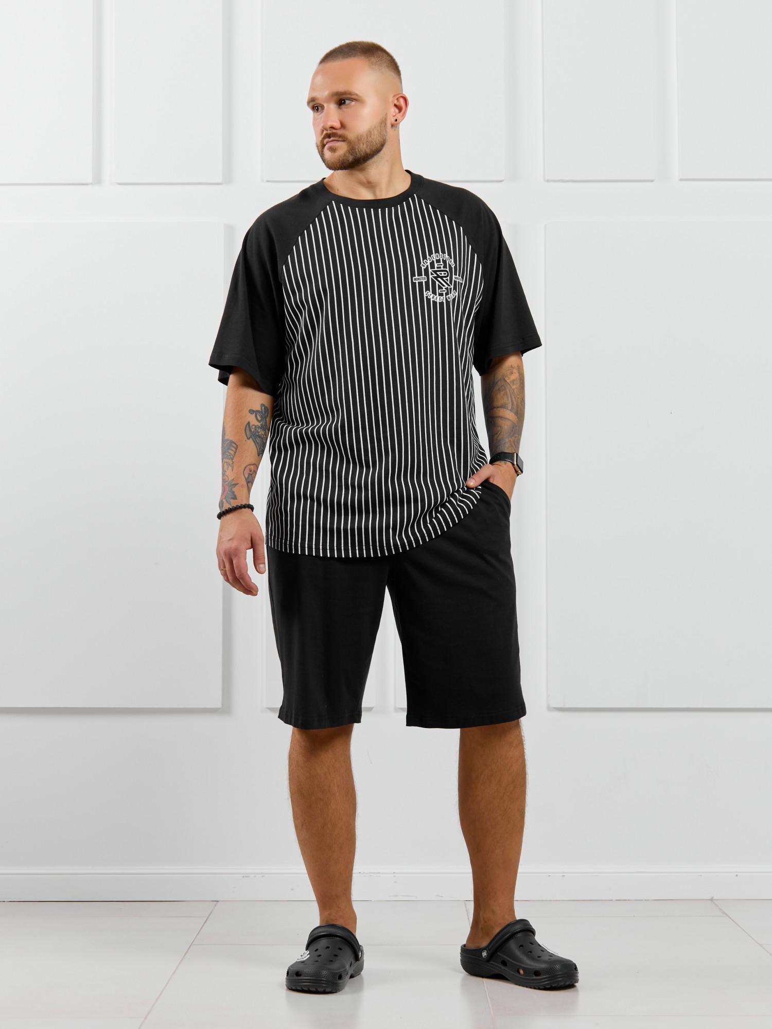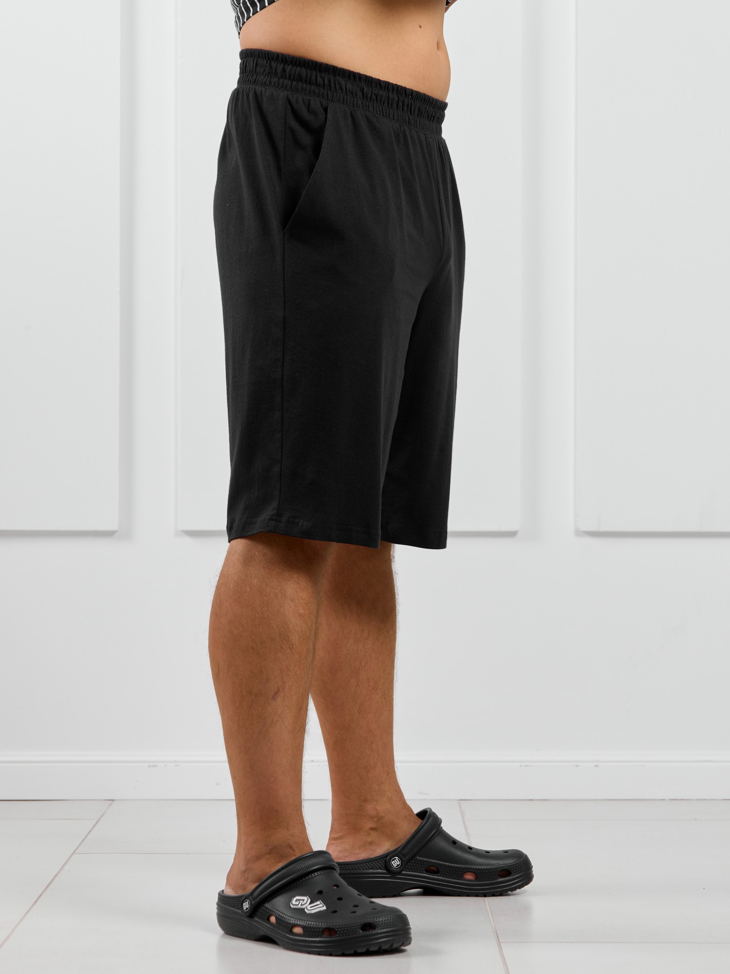 Базовые шорты из однотонного полотна кулирного переплетения черного цвета. Модель с боковыми карманами с обтачными входами, на притачном поясе с отстроченной эластичной тесьмой.