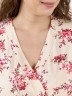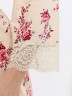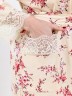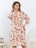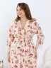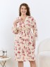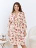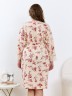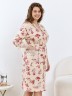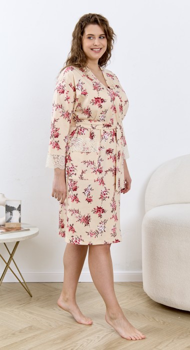 Халат женский из трикотажного полотна «кулирка» с набивным рисунком, на запахе, с втачными длинными рукавами, съемным поясам, продетым в две шлевки, вставленные в боковые швы на уровне линии талии. На правой полочке на уровне бедер – накладной карман прямоугольной формы. Борта и горловина обработаны притачной планкой. Верхний срез кармана и нижние срезы рукавов отделаны кружевом.