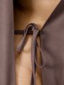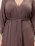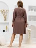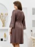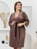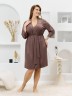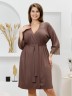 Халат из гладкокрашеного трикотажного вискозного полотна, на запахе, с втачными рукавами 3/4 длины, кружевными манжетами, притачной планкой по бортовым срезам и съемным поясом, продетым через две шлевки в боковых швах. Спинка с кружевной притачной кокеткой - V-образной формы, бортовая планка с кружевными вставками, переходящими на полочку.