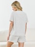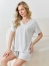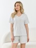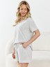 Костюм молодежный из гладкокрашенного трикотажного махрового полотна, состоящий из футболки и шорт. Футболка – классического покроя, с короткими втачными рукавами и V-образной горловиной, обработанной втачной планкой.Шорты - средней длины, свободные, на притачном поясе с эластичной тесьмой внутри и шнурком, продетым через две петли в центре пояса.