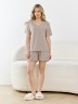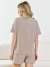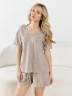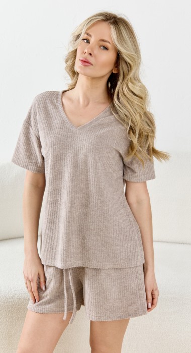 Костюм молодежный из гладкокрашенного трикотажного махрового полотна, состоящий из футболки и шорт. Футболка – классического покроя, с короткими втачными рукавами и V-образной горловиной, обработанной втачной планкой.Шорты - средней длины, свободные, на притачном поясе с эластичной тесьмой внутри и шнурком, продетым через две петли в центре пояса.