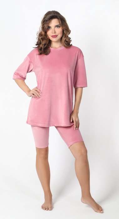 Костюм из гладкокрашеного трикотажного полотна «велюр стрейч», состоящий из футболки и леггинсов. Футболка – удлиненная, свободного покроя, со спущенной, линией плеча, короткими втачными рукавами, горловиной овальной формы, обработанной втачной планкой.Леггинсы – длиной до колен, с эластичной тесьмой по талии.