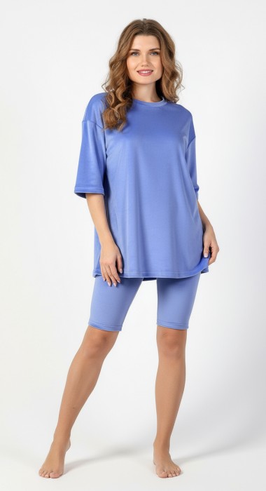 Костюм из гладкокрашеного трикотажного полотна «велюр стрейч», состоящий из футболки и леггинсов. Футболка – удлиненная, свободного покроя, со спущенной, линией плеча, короткими втачными рукавами, горловиной овальной формы, обработанной втачной планкой.Леггинсы – длиной до колен, с эластичной тесьмой по талии.