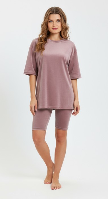 Костюм из гладкокрашеного трикотажного полотна «велюр стрейч», состоящий из футболки и леггинсов. Футболка – удлиненная, свободного покроя, со спущенной, линией плеча, короткими втачными рукавами, горловиной овальной формы, обработанной втачной планкой.Леггинсы – длиной до колен, с эластичной тесьмой по талии.