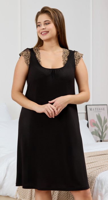 Сорочка женская из гладкокрашеного вискозного трикотажного полотна, свободного покроя, слегка расширенная к низу, с втачными рукавами - «крылышками», выполненными из кружева и втачанными в верхние части пройм. Расширенная иуглубленная горловина с кружевными отделочными деталями и сборкой по центру, окантована основным материалом.