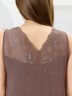 Сорочка женская из гладкокрашеного трикотажного вискозного полотна, без рукавов, полуприталенного силуэта, слегка расширенная книзу. V-образная горловина полочки и спинки отделана кружевными кокетками треугольной формы. Проймы окантованы основным материалом.