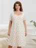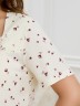 Сорочка женская из трикотажного полотна «кулирка» с набивным рисунком, свободного кроя, слегка расширенная книзу, с короткими втачными рукавами. Полочка – с двойными кокетками, кружевом в шве соединения кокеток с основной деталью и декоративной вставкой «петлей» для достижения небольшого эффекта драпировки. Основная деталь переда присборена по шву притачивания кокетки.