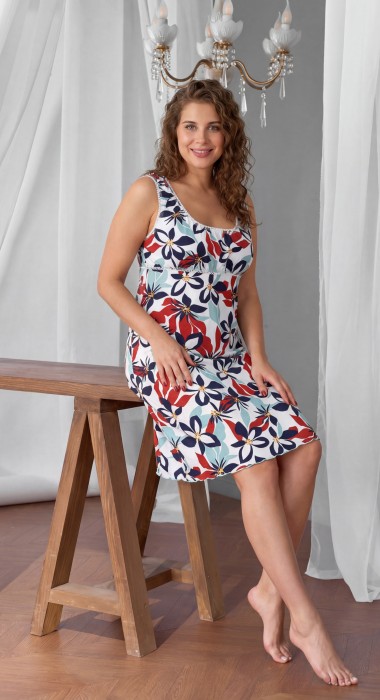 Сорочка женская из трикотажного полотна «кулирка» с набивным рисунком, расширенная книзу, без рукавов, с расширенной, углубленной горловиной овальной формы и притачной кокеткой по переду. Срезы пройм и горловины, а также шов притачивания кокетки, обработаны фасонной эластичной тесьмой с кружевным краем. Низ изделия обработан узкой обметочной строчкой.