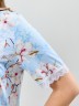 Сорочка женская из трикотажного полотна «кулирка» с набивным рисунком, свободного покроя, расширенная книзу, с короткими втачными рукавами и горловиной фигурной формы. Полочка – с притачной кокеткой V-образной формы, состоящей из двухч астей. Нижняя, основная деталь полочки присборена по шву стачивания с кокеткой. Низ рукавов, горловина и кокетка отделаны кружевом. В центре кокетки – два декоративных бантика из узкой атласной ленты