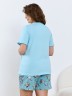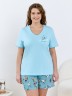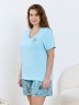 Пижама женская из трикотажного полотна «кулирка» в комбинации двух видов: гладкокрашеного и с набивным рисунком, состоящая из футболки и шорт. Футболка – из гладкокрашеного полотна, с короткими цельнокроеными рукавами, горловиной V-образной формы. Низ рукавов и горловина обработаны декоративной строчкой «кроше», на полочке печать, выполненная в технике «шелкографии».Шорты – из полотна с набивным рисунком, удлиненные, свободного покроя, с эластичной тесьмой по талии.