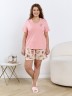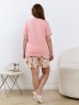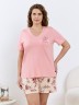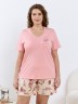 Пижама женская из трикотажного полотна «кулирка» в комбинации двух видов: гладкокрашеного и с набивным рисунком, состоящая из футболки и шорт. Футболка – из гладкокрашеного полотна, с короткими цельнокроеными рукавами, горловиной V-образной формы. Низ рукавов и горловина обработаны декоративной строчкой «кроше», на полочке печать, выполненная в технике «шелкографии».Шорты – из полотна с набивным рисунком, удлиненные, свободного покроя, с эластичной тесьмой по талии.
