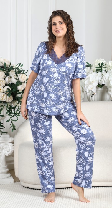 Пижама женская из вискозного трикотажного полотна с набивным рисунком, состоящая из футболки и брюк. Футболка – прямая, с короткими втачными рукавами. Полочка с V – образными кружевными деталями по горловине.Брюки - свободного покроя с эластичной тесьмой по талии.