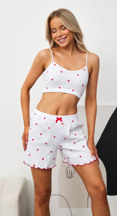 Пижама молодежная из трикотажного полотна «кашкорсе» с набивным рисунком состоящая из майки-топа и шорт. Майка-топ – на узких бретелях, с V-образным вырезом горловины, низ изделия с эластичной тесьмой, которая дает прилегание по фигуре.Шорты - укороченные, расширенные книзу, с эластичной тесьмой по талии и атласным бантиком в центре. Нижние срезы шорт обработаны узкой обметочной строчкой контрастного цвета, создающей красивый волнистый край.
