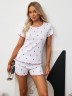 Пижама молодежная из трикотажного полотна «кашкорсе» с набивным рисунком состоящая из майки-топа и шорт. Футболка – полуприлегающего силуэта, с короткими втачными рукавами, горловиной овальной формы, окантованной основным материалом. По горловине выполнена декоративная строчка «кроше» контрастными нитками. Нижний срез рукавов и низ изделия обработаны узкой обметочной, создающей красивый волнистый край.Шорты - укороченные, расширенные книзу, с эластичной тесьмой по талии. Нижние срезы шорт обработаны узкой обметочной строчкой контрастного цвета, создающей красивый волнистый край.