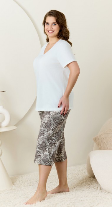 Пижама женская из трикотажного полотна «кулирка» в комбинации двух видов: гладкокрашеного и с набивным рисунком, состоящая из футболки и бридж. Футболка – из гладкокрашеного полотна, с короткими втачными рукавами и горловиной V-образной формы. Срезы горловины обработаны узким кружевом.Бриджи – из полотна с набивным рисунком, свободные классического покроя, с эластичной тесьмой по талии.