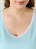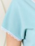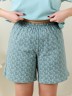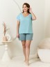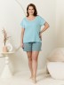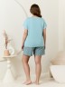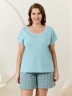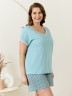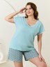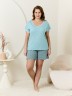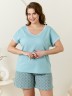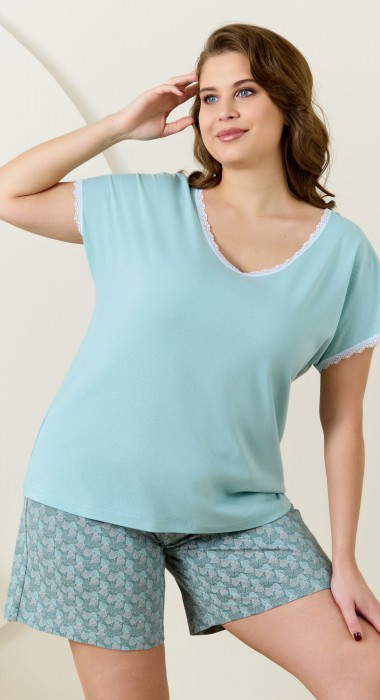 Пижама женская из трикотажного полотна «кулирка» в комбинации двух видов: гладкокрашеного и с набивным рисунком, состоящая из футболки и шорт. Футболка – из гладкокрашеного полотна, с короткими цельнокроеными рукавами, горловиной V-образной формы. Низ рукавов и горловина отделаны узким кружевом.Шорты – из полотна с набивным рисунком, удлиненные, свободного покроя, с эластичной тесьмой по талии.
