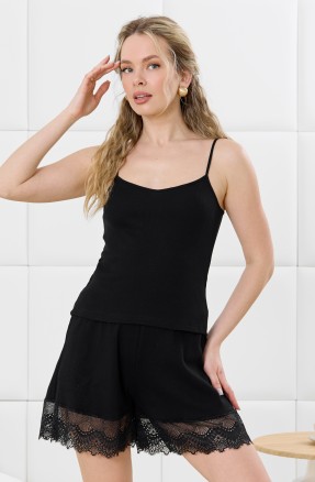 Пижама женская из трикотажного вискозного полотна с набивным рисунком, с отделкой кружевом, состоящая из майки и шорт. Майка - слегка расширенная книзу, с кружевной вставкой-кокеткой V-образной формы и небольшой драпировкой в центре груди.Шорты – удлиненные, с эластичной тесьмой по талии.